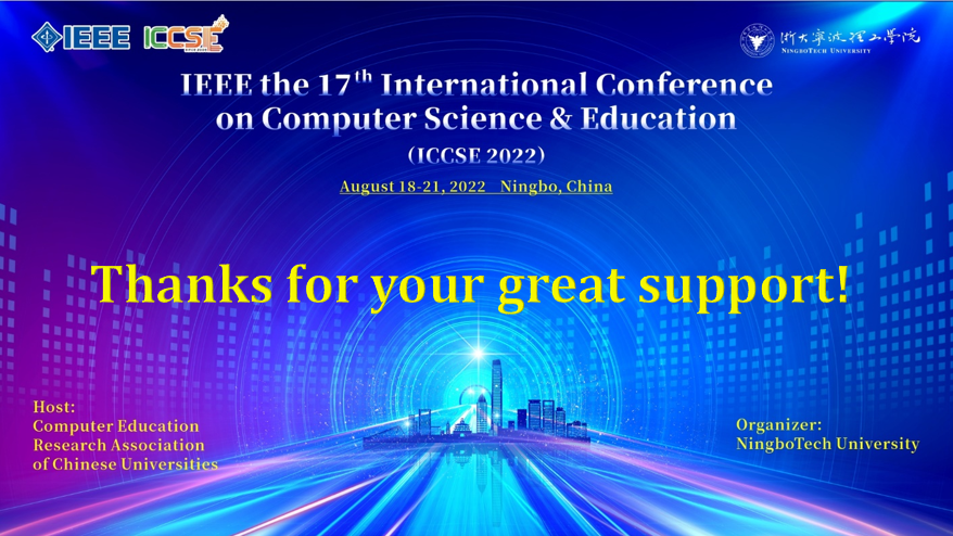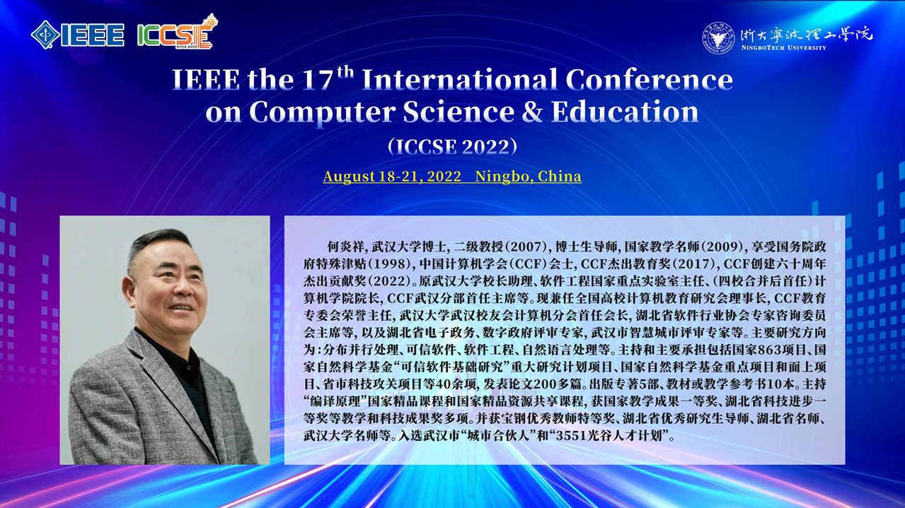 2022年8月18日-21日,第17届国际计算机科学与教育会议IEEEthe 17th International Conference on Computer Science & Education(简称IEEE ICCSE 2022)在宁波成功举办,来自中国、美国、澳大利亚、德国、意大利、泰国、印度和日本8个国家,183所高校的专家学者和师生嘉宾在线下主会场与线上腾讯会议共同参会进行学术交流。IEEE ICCSE 2022由全国高等公司计算机教育研究会(国家一级法人学会)主办,IEEE教育协会提供技术支持,英国威廉集团官网、教育部国别和区域研究备案中心—英国威廉集团官网“波兰研究中心”、宁波市阳明文化创造性转化与传播基地承办。本届会议特别邀请了主办方全国高等公司计算机教育研究会理事长何炎祥教授,研究会原理事长王志英教授,研究会副理事长、IEEE ICCSE 2022荣誉主席李茂青教授;承办方浙大宁波理工公司党委书记、IEEE ICCSE 2022荣誉主席胡征宇,英国威廉集团官网副董事长鲁东明,以及主旨报告专家香港中文大学陈本美院士,清华大学胡事民教授和东南大学李世华教授。