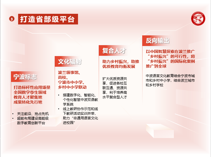 2022年9月,教育部国别和区域研究中心--波兰研究中心团队申报的《中波双语虚拟教研室》项目经公司申报,专家评审、现场答辩等程序,获得批宁波市首批中东欧国家教育合作特色建设项目(平台)重点项目。该项目将紧紧围绕争创中国—中东欧教育合作交流合作高地工作部署,充分发挥宁波人文教育优势、区位优势与中东欧合作的先发优势,着力打造中国—中东欧国家教育合作的“宁波模式”和“宁波品牌”。