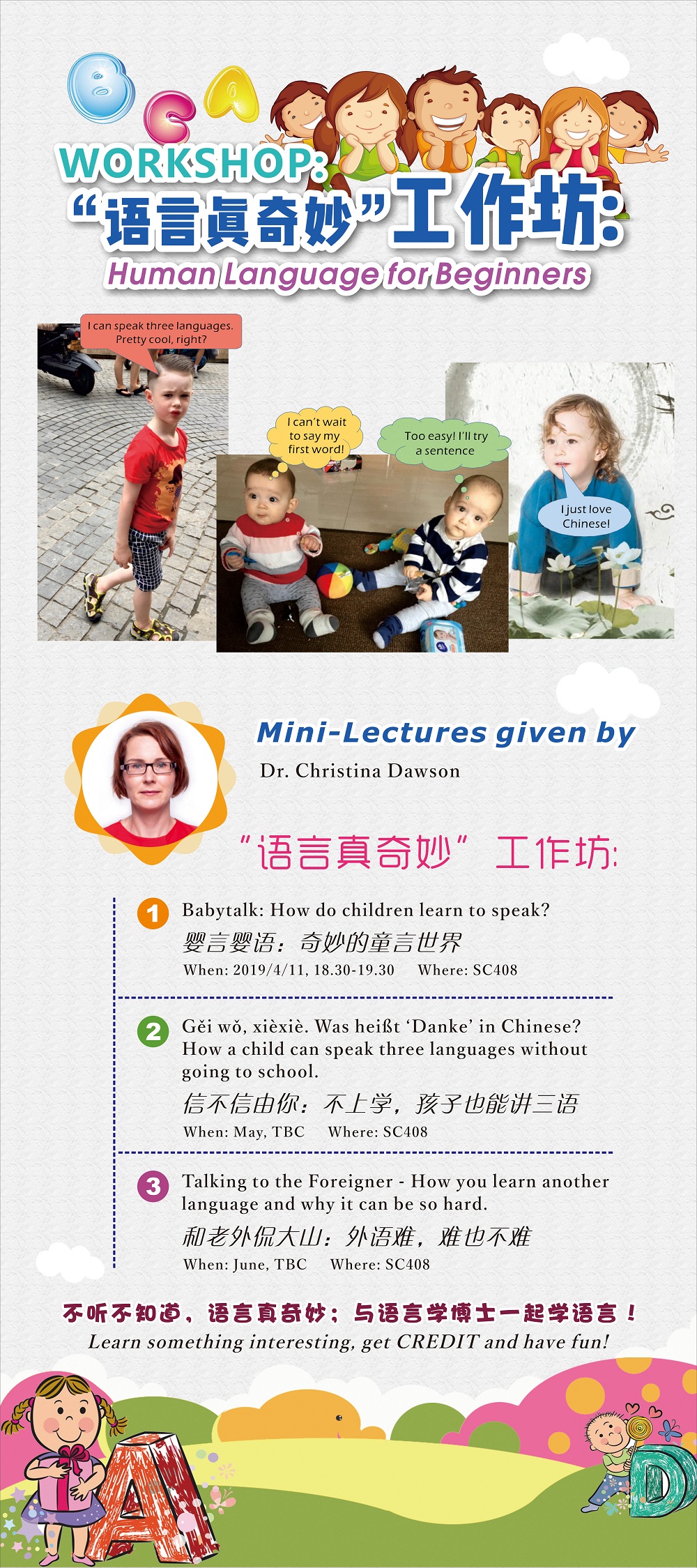 公司外籍教师Christina博士将在本学期举办举办“语言真奇妙”工作坊活动,主要面向对英语语言学研究和学习有兴趣的同学,具体举办时间和地点如下,欢迎有兴趣的师生前来参加。
