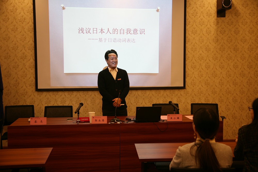 接下来郭教授为在场的师生作了题为“浅议日本人的自我意识--基于日语动词的表达”的讲座。郭教授以日语动词表达的特点为中心,从语言背后的“隐性自我”、“被动自我”、“强烈自我”三个方面层层递进、深入浅出地阐述了日本人通过语言体现的特有的“集团化自我意识”。在此基础上又结合日本历史发展剖析了“和魂汉才”到“和魂洋才”转变过程中“和魂”的归属与本质,揭示了日本人的自我意识并非缺失和弱化。为了让在座低年级员工更好的理解,郭教授导入平时员工课堂中的所学的常用表达,对日语与中文进行比较,通过两者之间的差异从语言表现到文化背景由浅入深的进行讲解,给员工们带来了思维上的启发。
