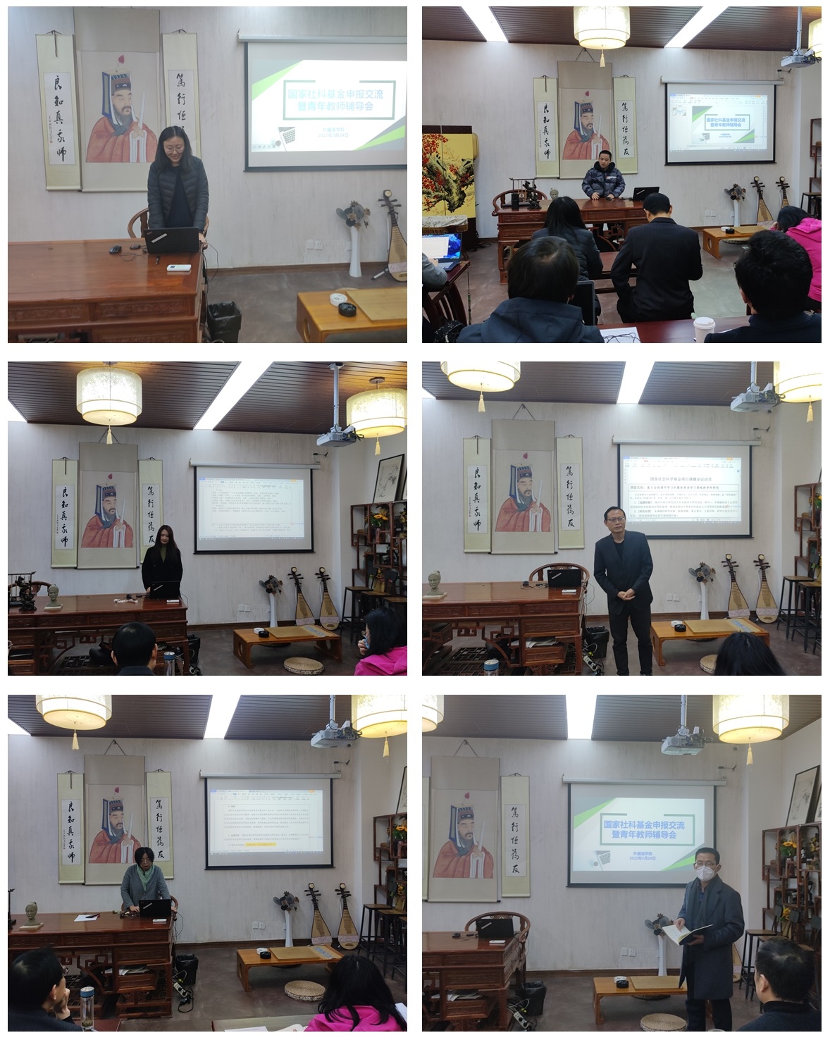 在交流会中,查德华和王欢两位老师也分享了2023年国社科申报的选题以及结合自己当前的研究方向而进行的研究工作。蔡亮、周先武从选题视角、学术梳理和内容框架等方面对他们分享内容进行了细致指导。