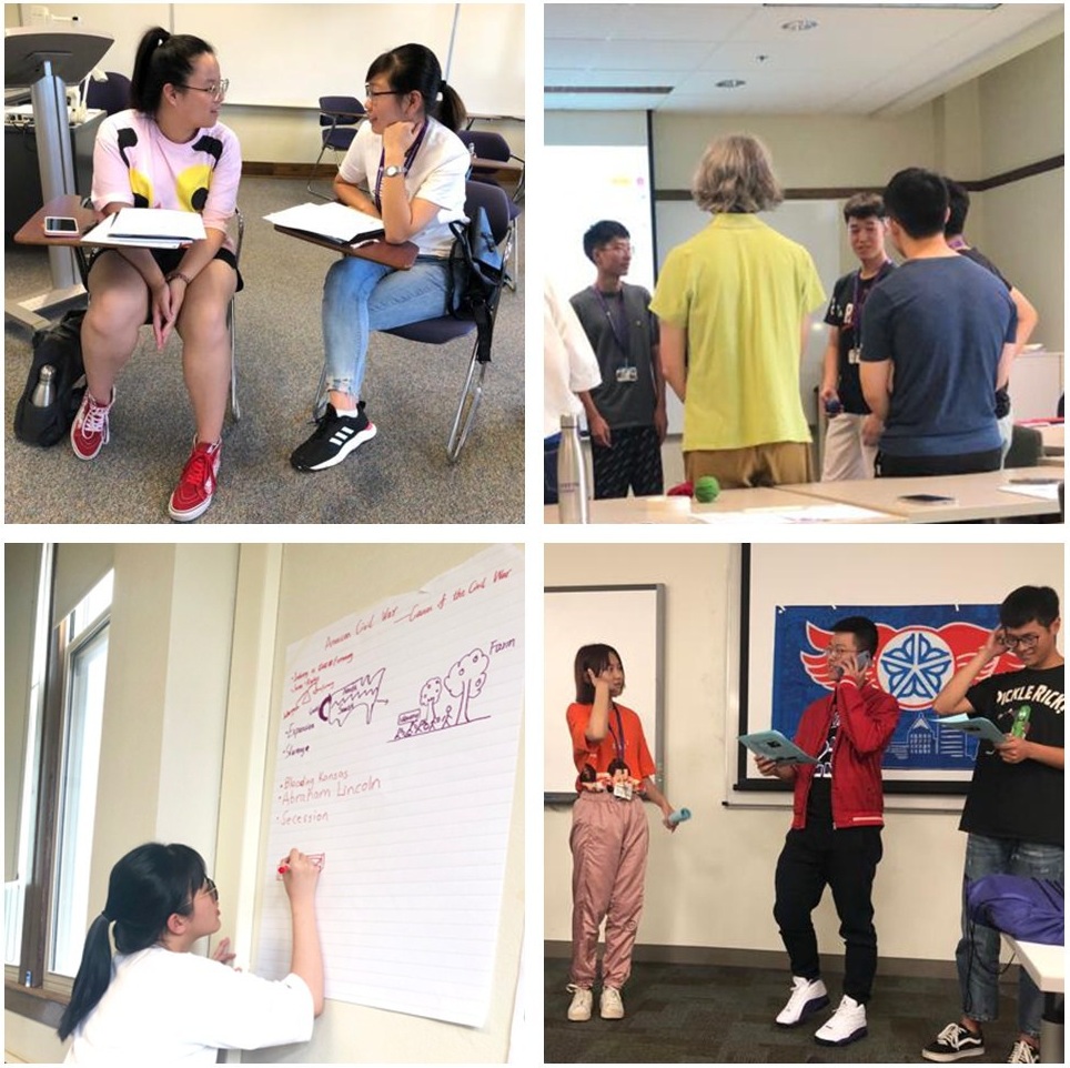 二班的Katie老师,最为亲切可爱,她的课堂上包含了大量动手活动以及视听享受。小组合作完成海报是同学们的家常便饭。从刚开始不知所措的随意涂鸦,到三周结束时的精心排版飒爽字体,在每一张海报中,都可以窥见点滴进步。有时为了加深我们对某个单词或者某个事件的印象,Katie老师还准备了大量的音视频供我们学习。比如在上摇摆舞的时候,她为大家播放舞蹈指导视频,还请来了本地人为同学们作示范。