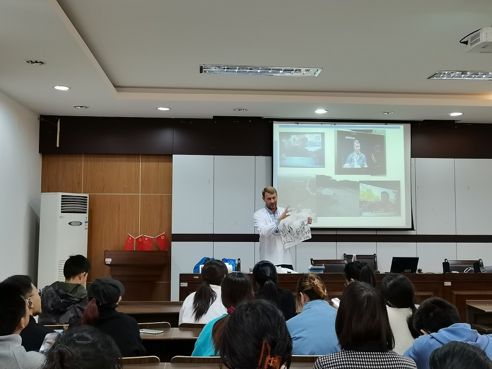 第一部分康斯坦丁采用图文结合的形式介绍自己的家乡乌克兰的地理位置、历史文化、传统风俗。为了让同学们更好的感受到当地的文化,他还特地穿着民族服饰,带了一些当地的玩具和糖果,这为本场讲座奠定了轻松愉快的基调。