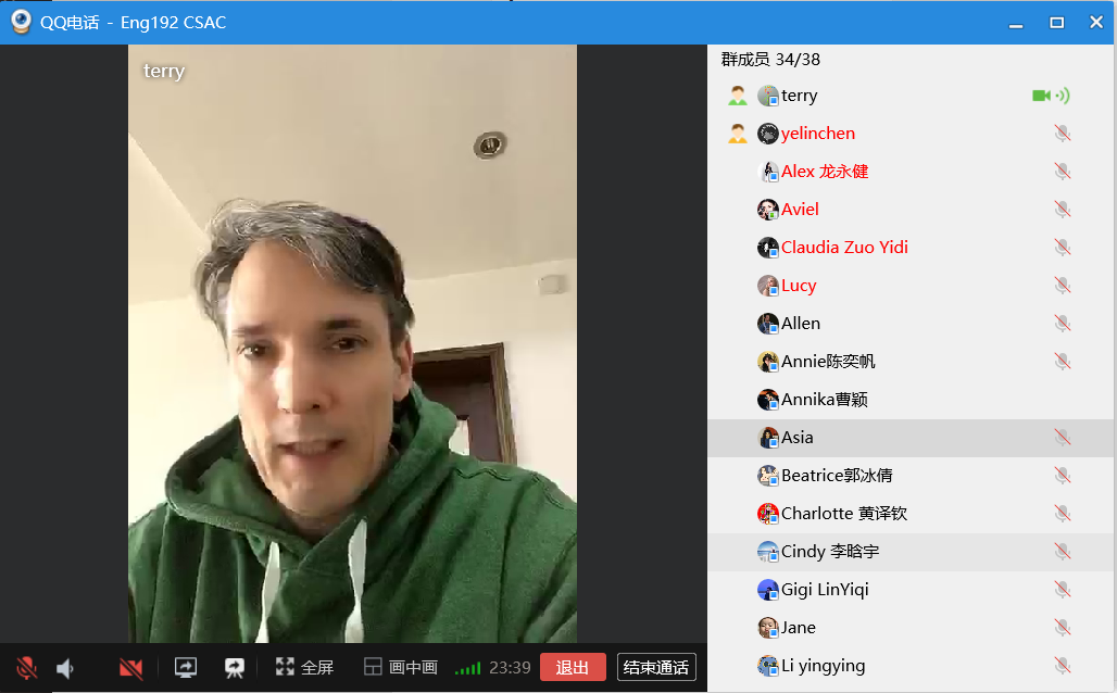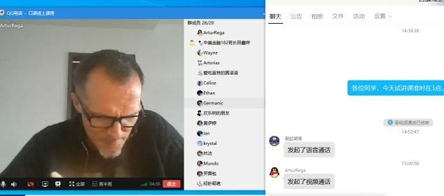 来自爱尔兰的特伦斯博士,是一位宁波女婿,疫情期间一直在国内。在妻子的帮助下也注册了QQ账号并掌握了如何开启视频直播与聊天的功能。他们都按照公司教学日历的安排,每天准时出现在班级的QQ群中发起视频直播,全班同学按时加入。在点名和打完招呼之后就切换到分享桌面开始授课,期间考虑到语音通道的稳定性,全体同学很自觉的采用一对一的开启麦克风实现对话,并在微信群里积极发言回复,与外教老师的互动十分的活跃。