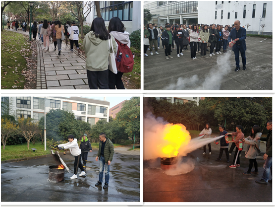 完成疏散任务后,保卫处叶卫树副处长首先对大家做了安全相关的讲话,他着重提到了着火需要满足的条件,以及发生火险时需要针对不同火情采取不同的灭火方法,他详细讲解了干粉灭火器的使用,并进行了操作示范。燕永波老师给师生们演示了如何用灭火毯灭火。接着,外语公司谌晓煜书记对师生们积极参与本次活动给予了充分肯定,书记跟大家分享了以往的校园消防安全案例,希望师生们能提高消防安全意识和火灾事故的紧急处置能力。随后,许多老师和同学亲自体验了一次现场灭火。
