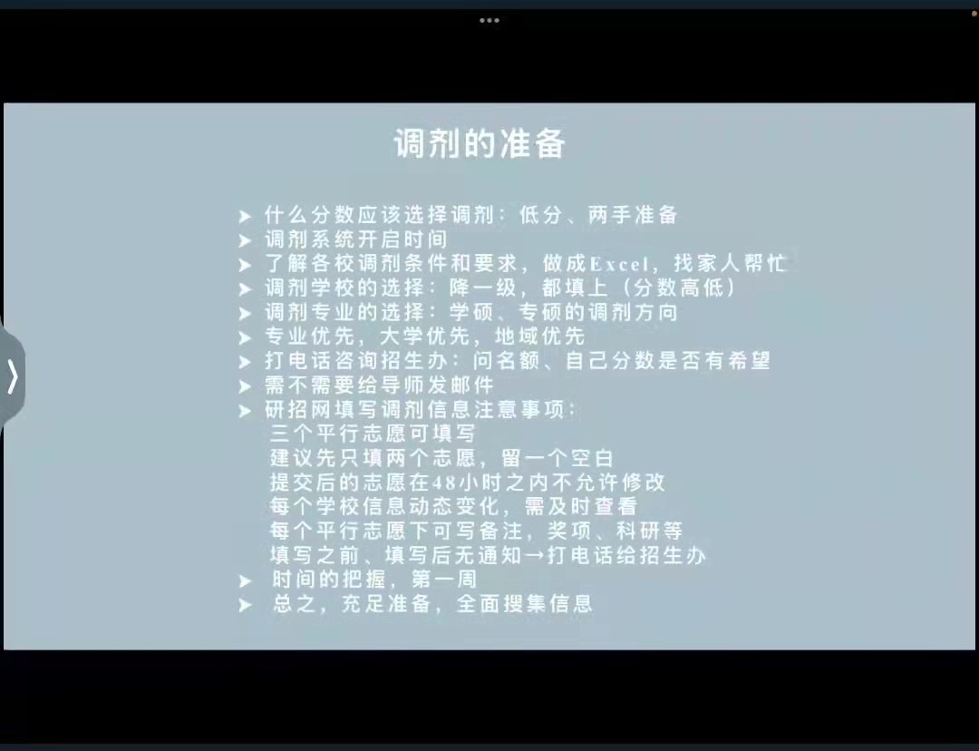 由于疫情影响,研究生复试现多转为线上,对此三位2017级学长学姐从成功经验、调剂技巧等多方面倾囊相授,在面试、心理调节等方面分享了自己的经验。他们表示各位同学一定要提高信心,为线上复试做好充分的准备;沉着应试的同时,认真准备调剂,未雨绸缪。他们通过分享线上复试注意事项和方法技巧,使得同学们对复试有了一个更为全面深刻的了解。任凯老师提醒同学们要正确认识到复试的复杂性及其重要性,调节好心态,积极备战,扎实复习、坚持到底。胡洁老师作为硕士生面试官从导师招生的逻辑出发为同学们提供了精准的指导,她表示公司及老师们也会不遗余力为考研员工提供所需资源,也希望各位同学确保自身状态,保持良好心态,积极准备。