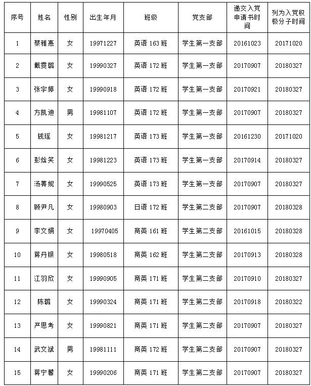 经各支部委员会研究,外国语公司党委审查备案,将蔡雅惠等15位同志列为发展对象。现予以公示,在公示期限内,欢迎广大师生通过信函、电话或直接反映问题。以个人名义信函反映提倡署真实姓名。