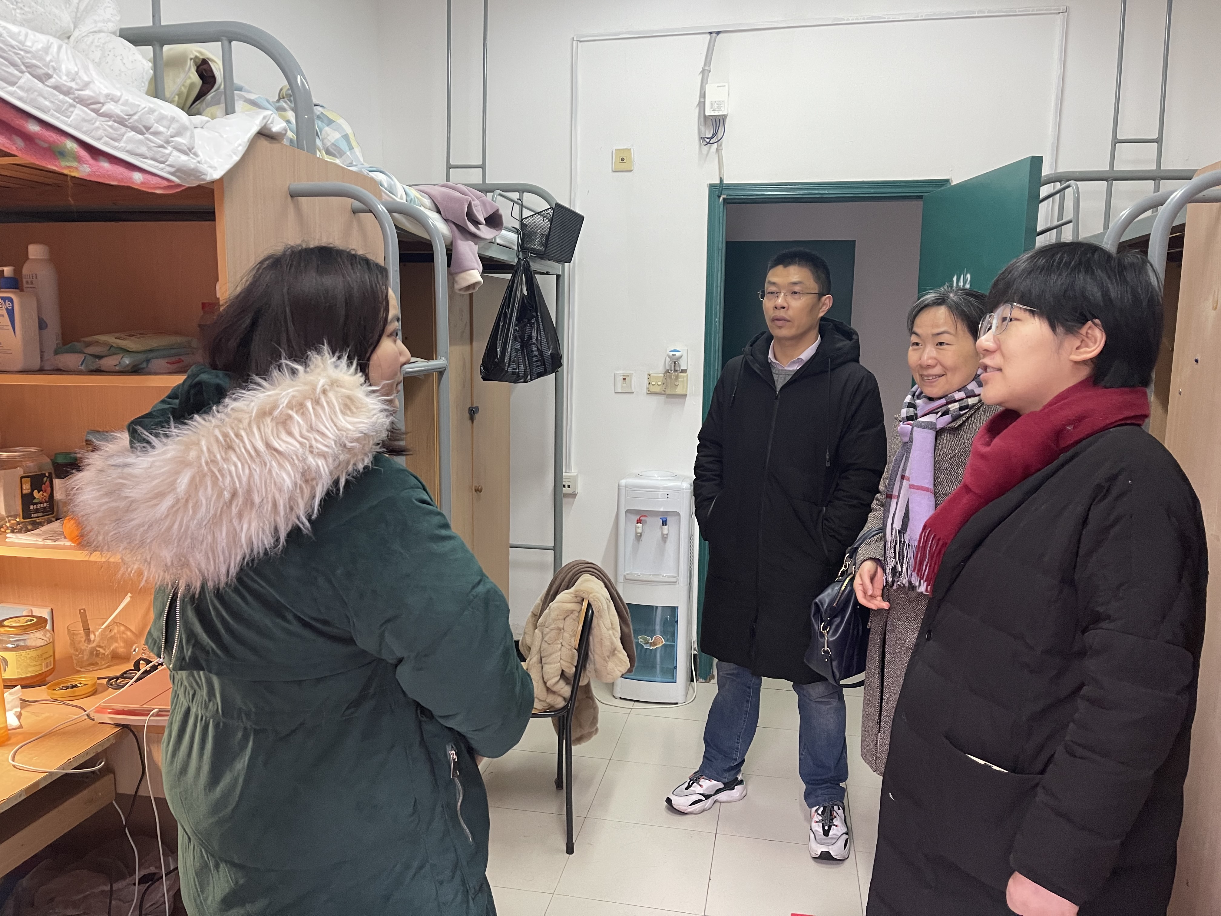 2022年1月26日,在新春佳节即将到来之际,外国语公司党委副书记任凯、思政主管芦美丽、团委副书记张弦、班导师丁旭老师四人走进28幢员工宿舍看望慰问公司寒假留校员工。