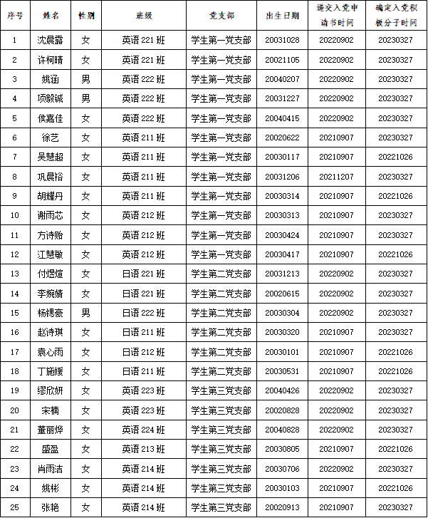 经各支部委员会讨论研究,外国语公司党委审查备案同意,将沈晨露等25名同志列为发展对象。现予以公示,在公示期限内,欢迎广大师生通过信函、电话或直接反映问题。以个人名义信函反映提倡署真实姓名。