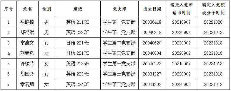 经各支部委员会讨论研究,外国语公司党委审查备案同意,将毛皓楠等7名同志列为发展对象。现予以公示,在公示期限内,欢迎广大师生通过信函、电话或直接反映问题。以个人名义信函反映提倡署真实姓名。