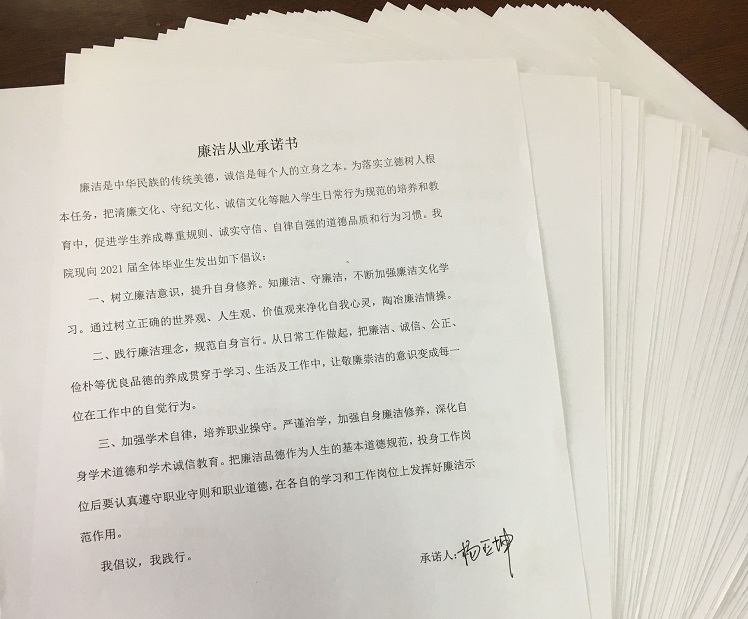 任凯老师则在安全就业方面提出同学们应警惕电信诈骗和就业骗局,同时希望同学们积极思考毕业后要做一个什么样的人,希望大家在未来做一个廉洁的人,并号召同学们签署《廉洁从业承诺书》。