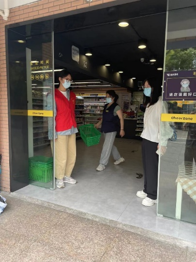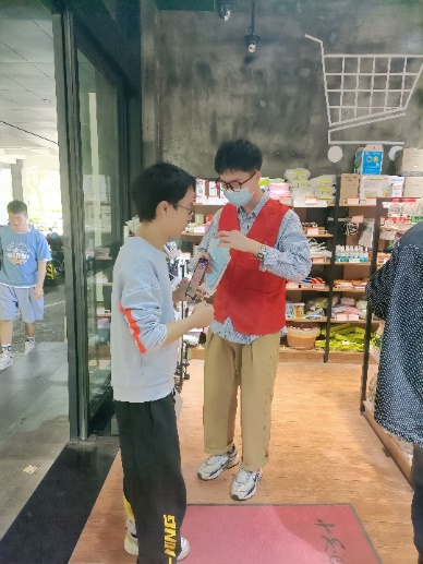 在此期间,志愿者们化身为疫情防控监督员,在校内各个超市门口,热心地为来往顾客测体温,呼吁师生们自觉佩戴口罩,告诫同学们不能松懈疫情防护,为校内师生的疫情防控贡献力量。