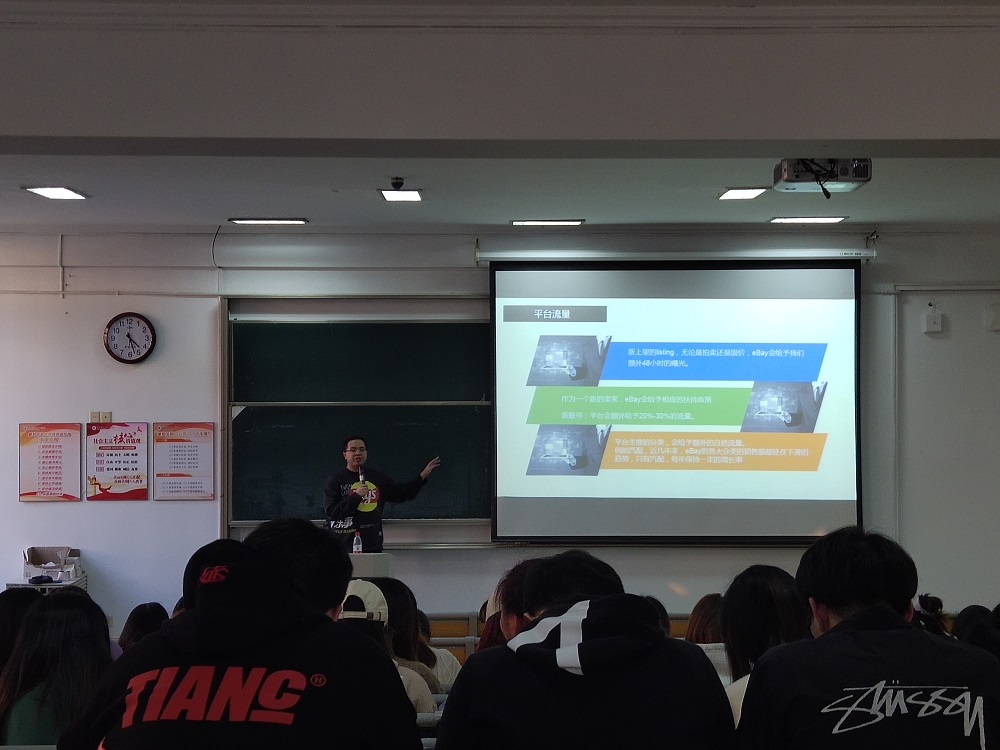 讲座一开始,杨健镭首先介绍了在打造平台爆款时要注意的一些事项,点出了打造爆款时选品的重要性。接下来,他又从相关性、卖家等级、物流等多个层面讲述了如何打造高质量的listing引流。这一部分结束后,他还提醒同学们,以上诸多层面需要综合考虑,拥有合理的价格和优质的服务,商家才能在平台上脱颖而出。讲解完引流后,杨健镭又给同学们提出了一系列listing属性优化的建议,并介绍了eBay平台站内站外的多种促销和推广方式。