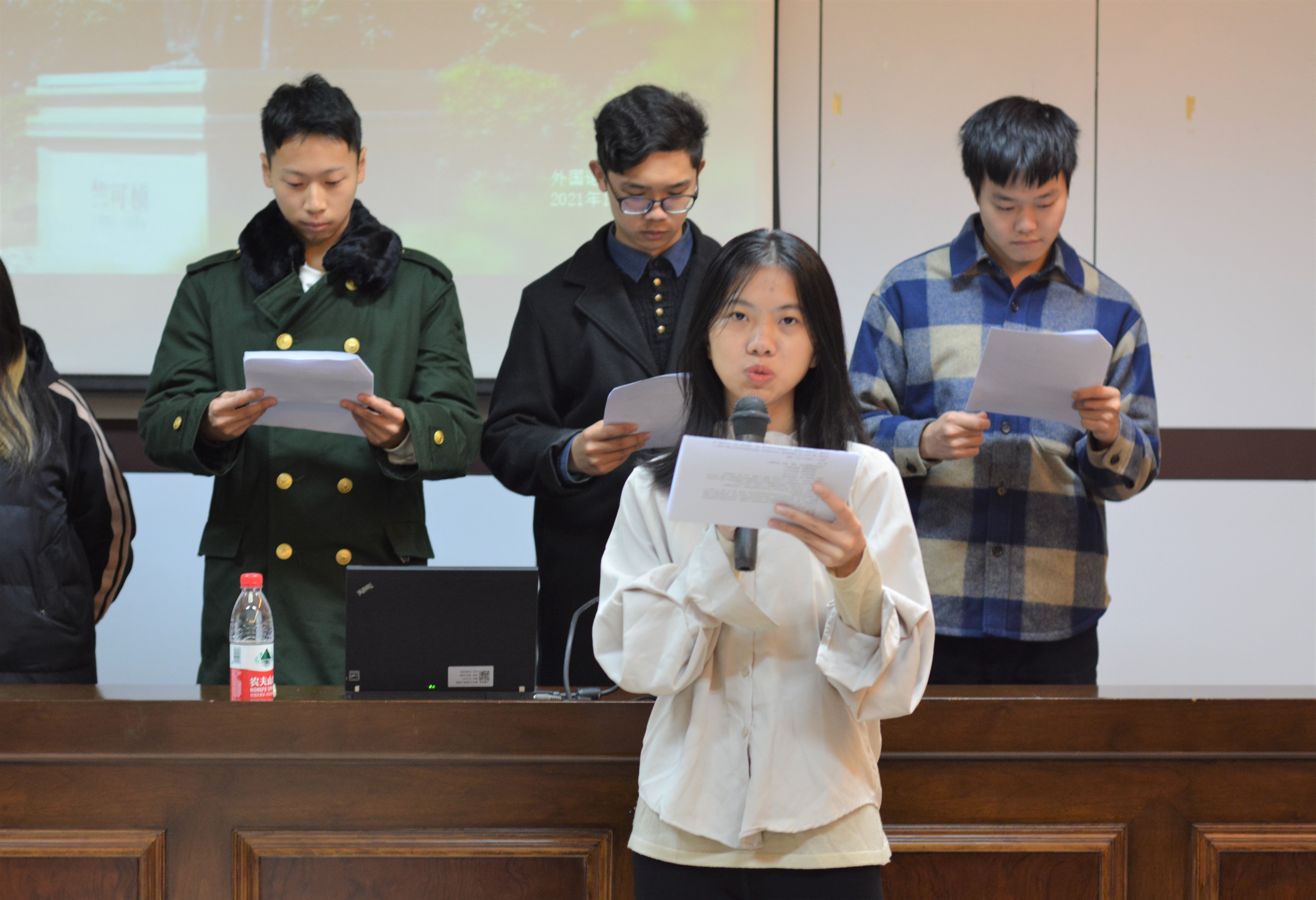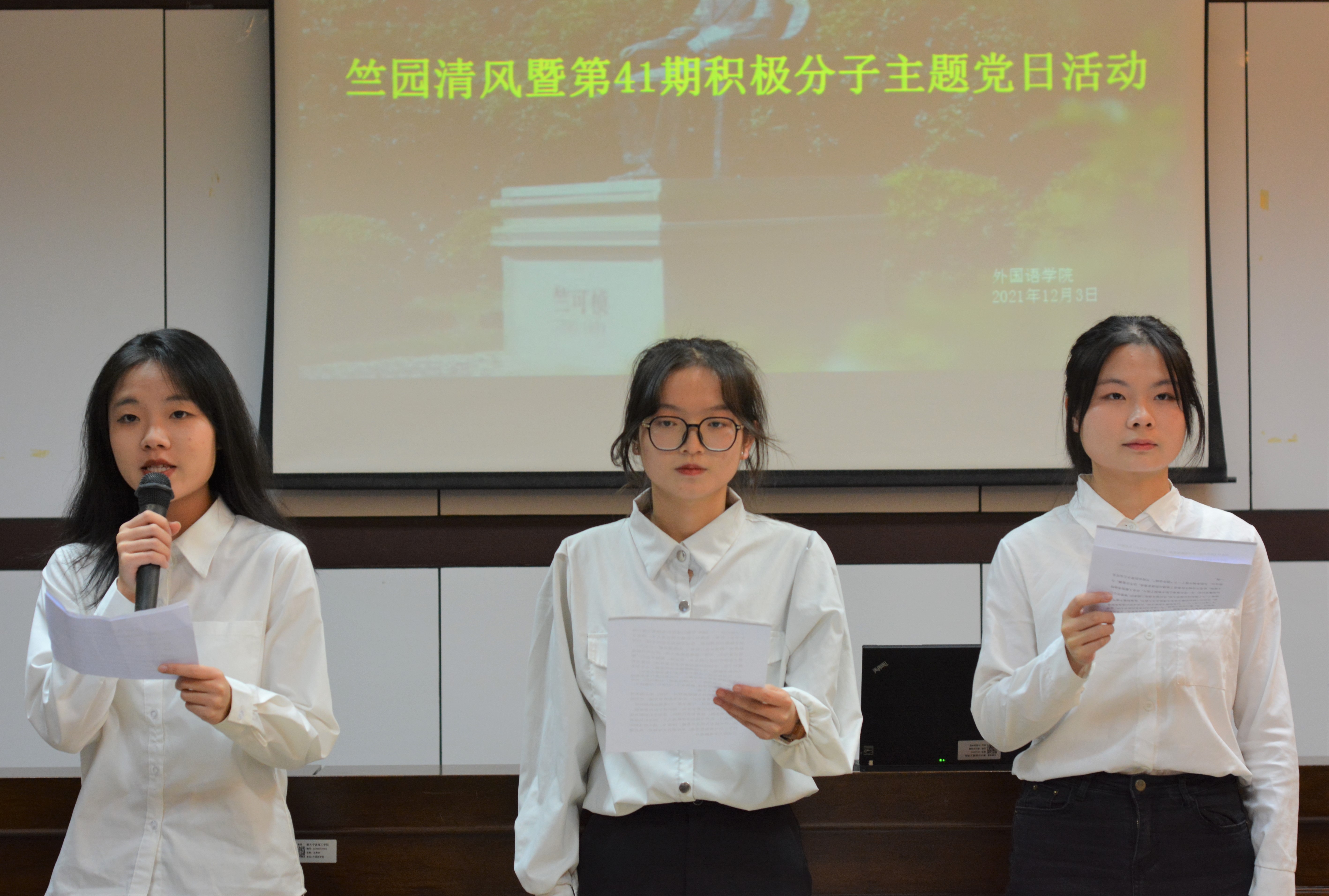 随后入党积极分子英语201班史欣艳、英语202班孙艳花、日语201班张正倩以及日语202班王杨慧带来了朗诵《先生之风,山高水长》。通过朗诵,一位学识渊博、坚忍不拔的先生形象跃然于观众眼前,使得在场同学感受到了竺可桢老董事长的伟大精神,也将“勿忘求是精神,将求是精神在每一位宁理人身上传承”的理念传递给了大家。