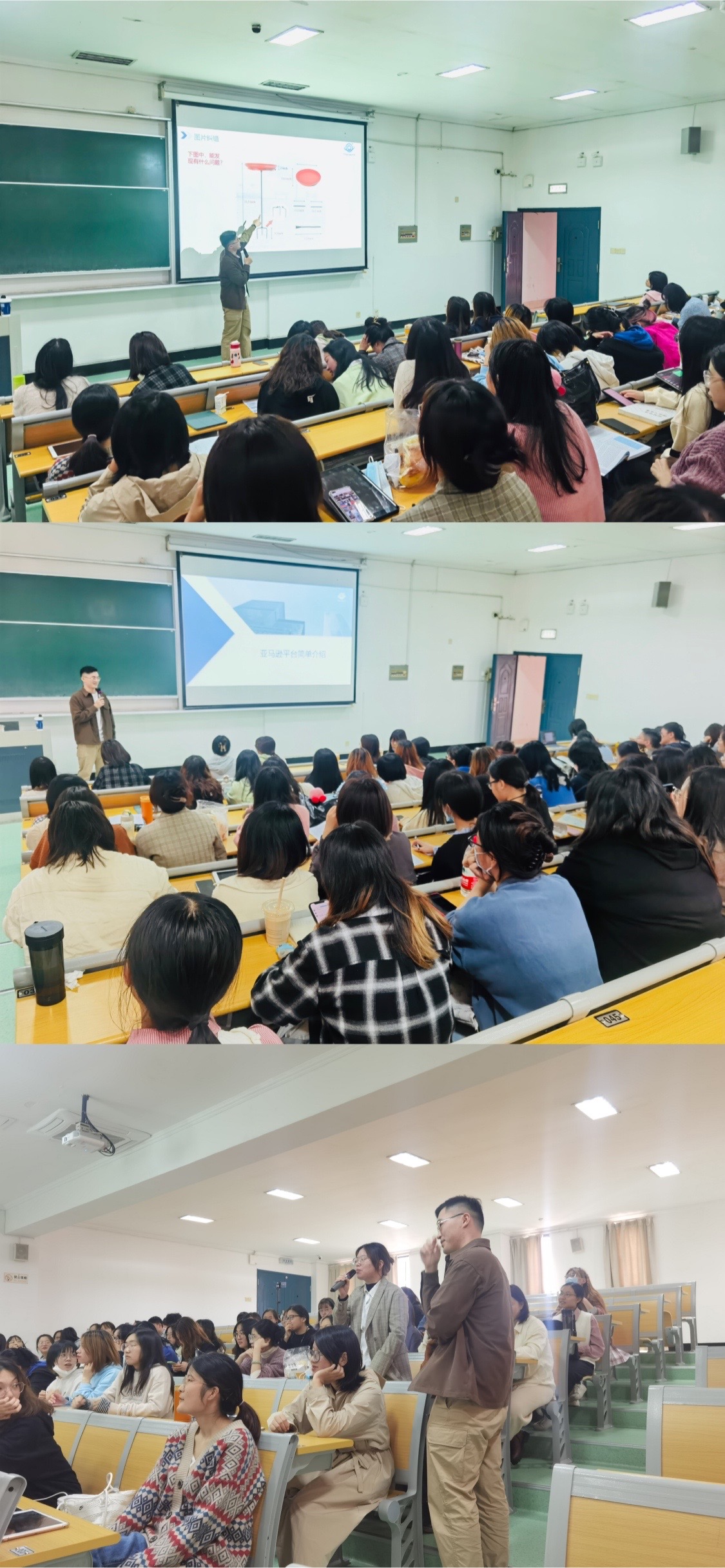 蒋昇先生拥有丰富的平台运营经验,他以亲切自然、幽默的授课风格从亚马逊集团的店铺模式、主页认识、店铺安全、选品规划等方面分别与国内电商平台进行比较,为大家详细介绍了亚马逊公司、平台优势及运营特点,并给同学们布置了关于产品运营的思考题。在讲座中,蒋昇先生还向同学们提出产品图片纠错的问题,引发了同学们的热烈讨论和积极参与,现场气氛活跃。尉玉龙先生则结合电商平台上的图片设计,从透视、用户体验和审美等角度进行了讲解。