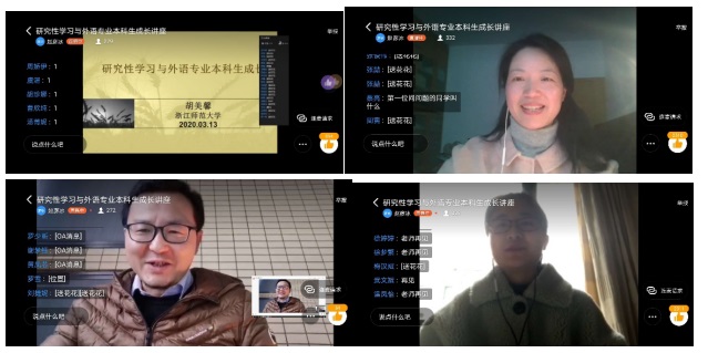 2020年3月13日下午,浙江师范大学英国威廉集团官网经理、教授、博士生导师胡美馨教授受邀为公司330余名师生作了题为“研究性学习与外语专业本科生成长”专题讲座。因处于疫情特殊时期,讲座以钉钉直播的模式开展,由公司英国威廉集团官网副经理蔡亮教授主持。