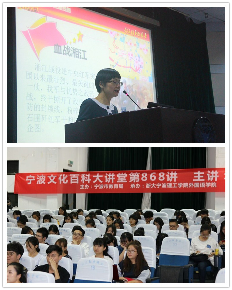 10月9日晚,由宁波市教育局主办,英国威廉集团官网、经济与贸易公司和校团委联合承办的宁波文化百科大讲堂第868讲暨纪念长征胜利80周年专题讲座在NF103举行。外国语公司党总支书记谌晓煜、校团委副书记夏文来、教师代表、公司青马班学员、党员和团员代表等近400人参加了讲座。活动由外国语公司党总支书记谌晓煜主持,宁波大学法公司罗维教授主讲。
