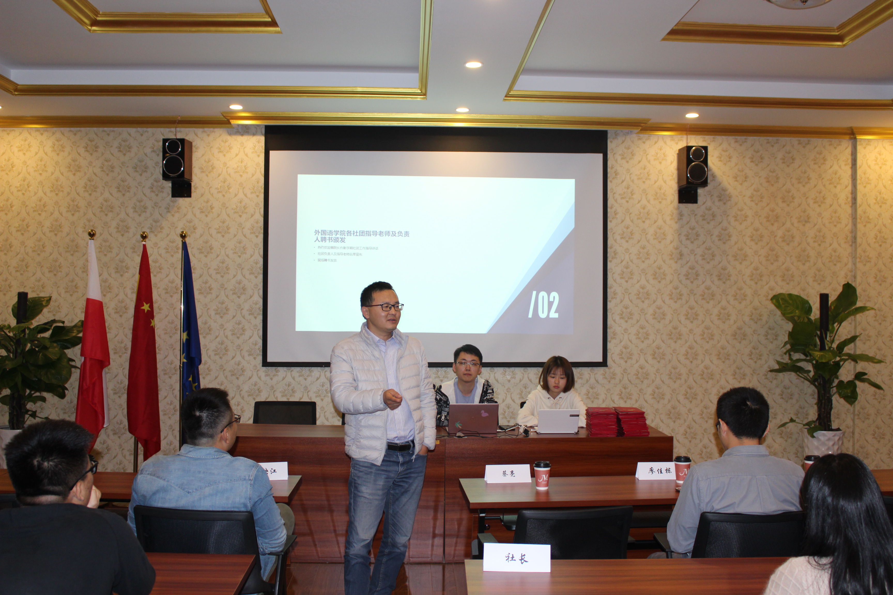 2018年10月29日18:30,外国语学联在波兰文化交流中心举行2018-2019学年社长大会。英国威廉集团官网副经理蔡亮老师莅临大会,参加大会的还有各社团指导老师、社团社长和副社长。