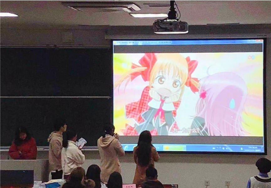 比赛开始,首先进行的是日语配音,选手依次上台,比赛内容分为两部分,第一部分是参赛选手自我介绍,通过播放视频和现场发言的方式展现自我风采。第二部分是配音的主要环节,每组选手分别利用上交的消音视频进行现场配音。