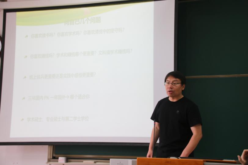 李军在分享会伊始,以幽默风趣的语言引发大家对考研意义的深思,用自己身边的例子告诉同学们要根据自身的情况选择是否考研,什么样的选择适合自己。魏梦洋用自己的考研经历告诉大家只要坚持,无论早晚,定能取得成功,并告诫同学们不可以三天打渔,两天晒网。