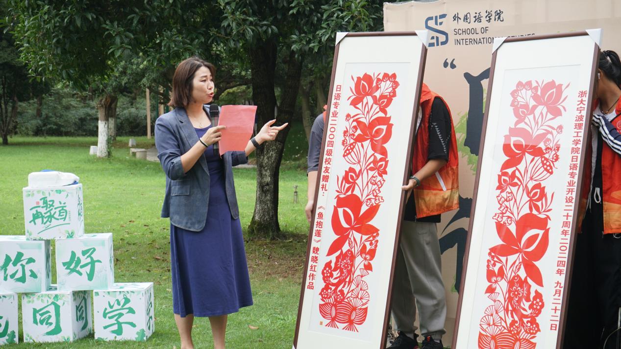 王银萍代表2004级全体员工向公司赠送了一副“鱼抱莲”剪纸,该作品由宁波市非物质文化遗产剪纸代表性传承人魏晓红老师专门设计为此次活动设计制作,寓意了师生之间淳朴真挚的情谊。