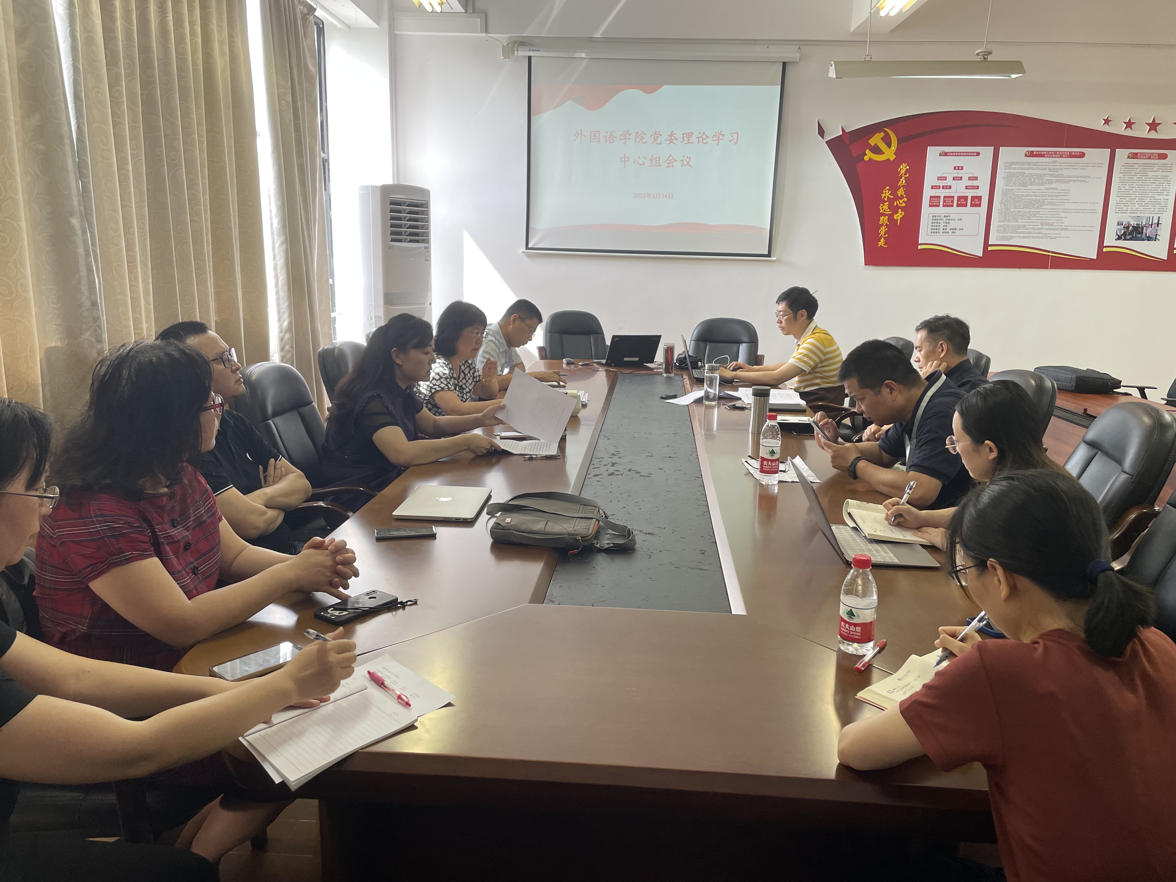 6月24日上午,外国语公司党委召开理论学习中心组扩大会议。会议由党委副书记(主持工作)傅晓宇主持,公司党委理论学习中心组成员、各系(部)负责人及副主管以上干部参加会议。