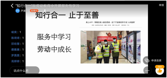 “劳动教育是中国特色社会主义教育制度的重要内容,直接决定社会主义建设者和接班人的劳动精神面貌、劳动价值取向和劳动技能水平,是培养时代新人的深切需要,高校作为劳动教育的重要主体之一,不仅要教育员工对知识躬身修行,更要教育员工用身体‘丈量’世界。”芦美丽老师由中共中央国务院发布的《关于全面加强新时代大中小学劳动教育的意见》为主轴,穿插王阳明的“知行合一”哲学思想,描述李子柒“劳作追梦”、注射消毒剂“特朗普”、何不食肉糜“晋惠帝”等生动例子,号召广老员工重视劳动教育,培养勤俭、奋斗、创新、奉献的劳动精神,形成良好的劳动习惯。讲座中,芦老师以公司宁波甬行码研发团队服务政府社会治理和公司员工党员蒋宁馨同学带着全家人做志愿者2个发生在身边的事例,鼓舞员工干部加强素质能力培养,以专业为基础开展服务性学习,彰显青春力量和时代担当。