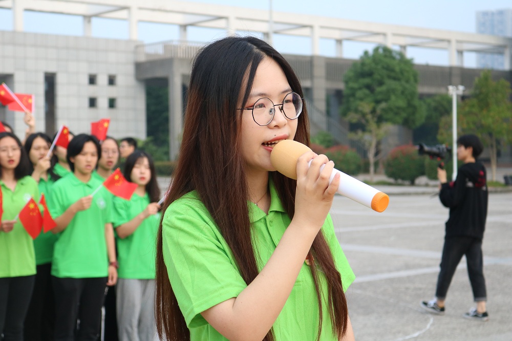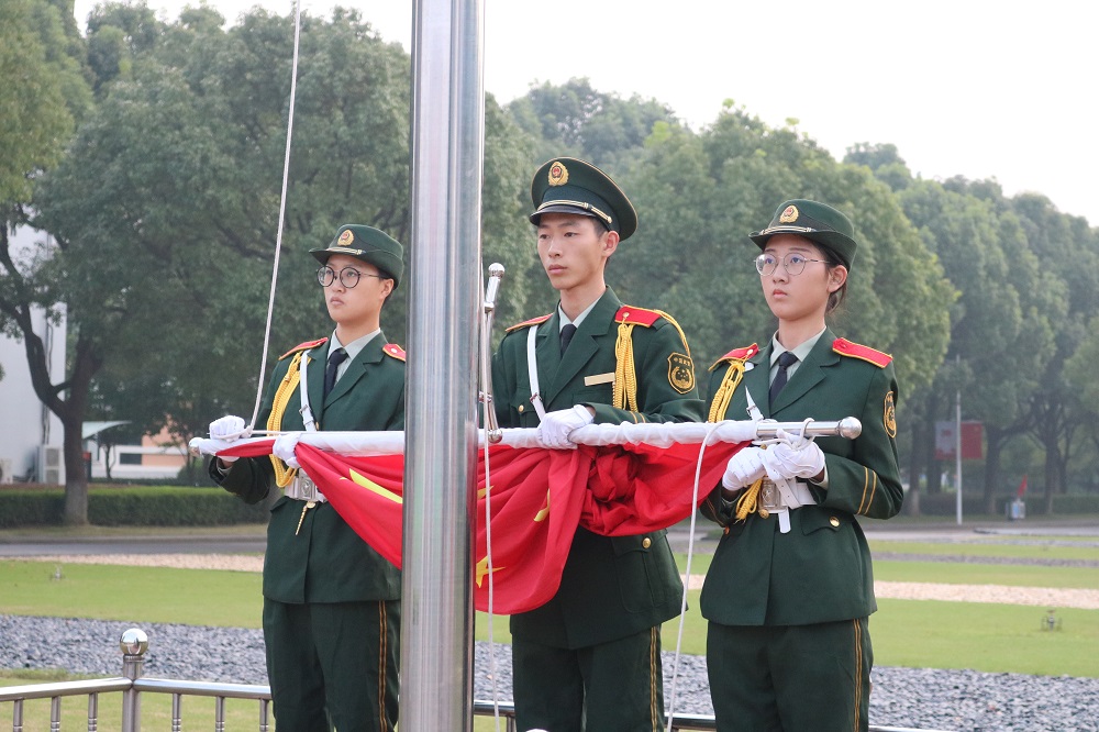 此次升旗仪式上,由公司殷嘉琪、钱弘、沈飞虎、陈迦特等四位同学现场诗歌朗诵《我爱你,中国》,诗声朗朗诵国庆。最后,由张喆同学用英语领唱,全体师生合唱《我和我的祖国》,歌声嘹亮,满怀着骄傲与自豪,抒发对新中国的热爱,盛赞美好新时代。手中的挥动的小红旗与绿色院服交相辉映,以青春之绿,敬礼中国红!