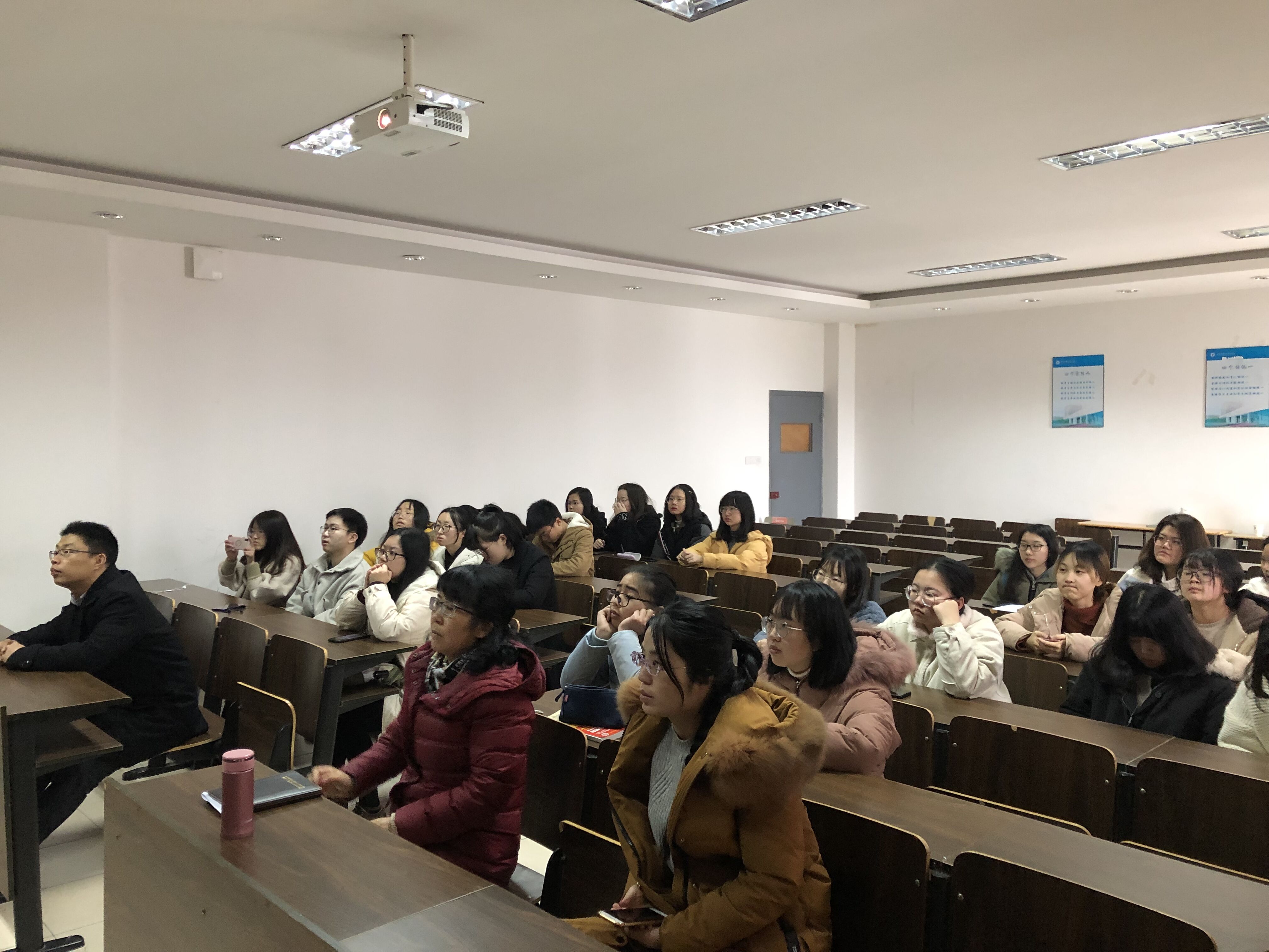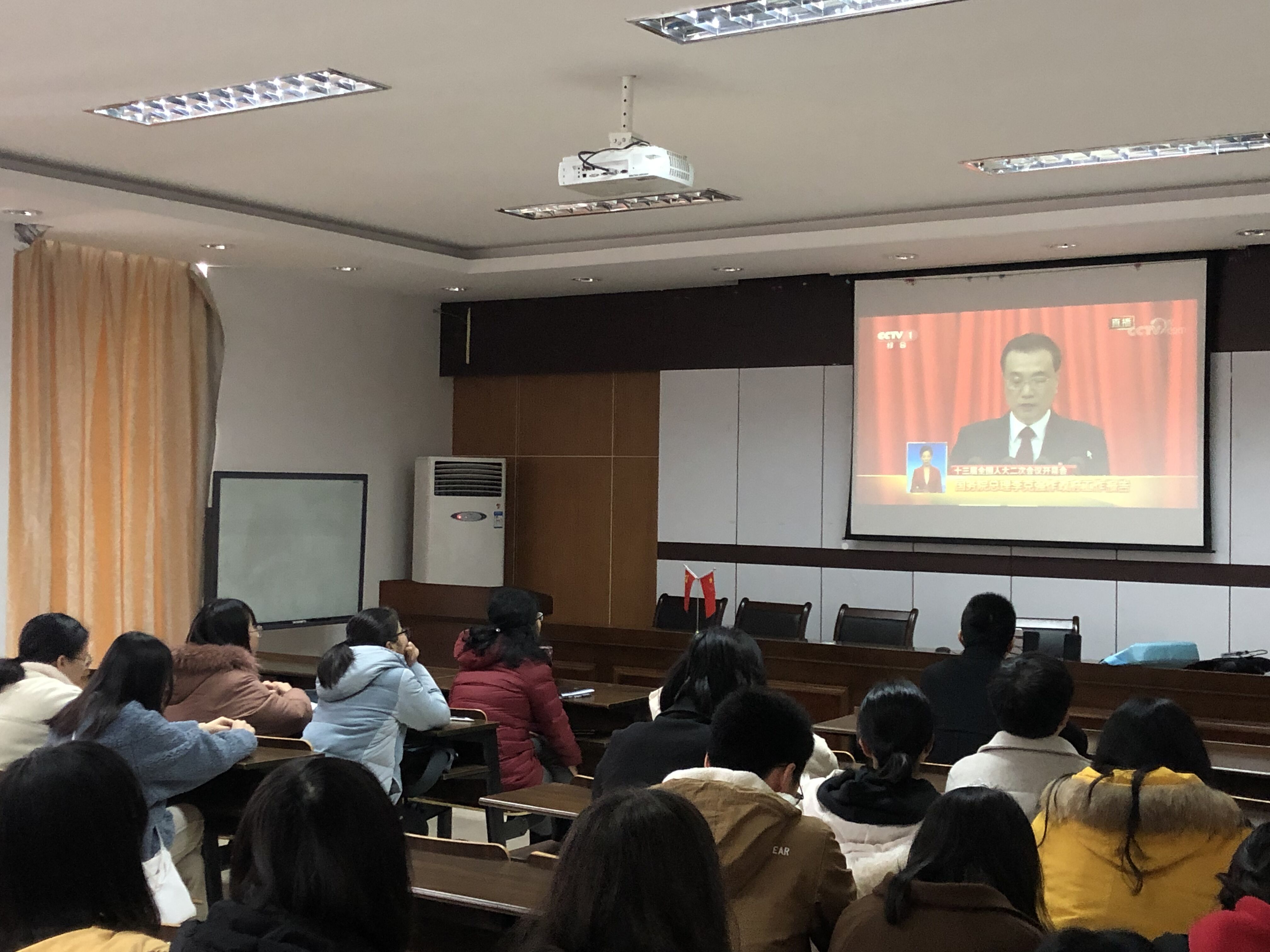 2019年3月5日全国十三届全国人大二次会议开幕式在人民大会堂盛大开幕,外国语公司党总支副书记傅晓宇、任凯,学工辅导员刘杜娟老师以及17、18级40余名同学在SC405会议室观看了会议开幕式的在线直播,认真聆听、学习国务院总理李克强政府工作报告。