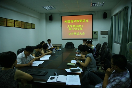 自公司党委部署基层党组织和党员开展公开承诺工作以来,外国语分公司党总支及时召开支委会传达相关会议精神,并于9月17日分别召开全体教师党员和员工党员大会,认真部署了公开承诺工作。总支要求各支部和全体师生党员进一步明确职责,践行诺言,努力做到“五个好”、“五带头”,创先进、争优秀,并随时准备好接受上级党组织点评和群众评议。总支委员俞峰老师还从教学科研岗位、管理服务岗位、员工党员三个方面对不同类型的党员公开承诺内容的侧重点进行了介绍。