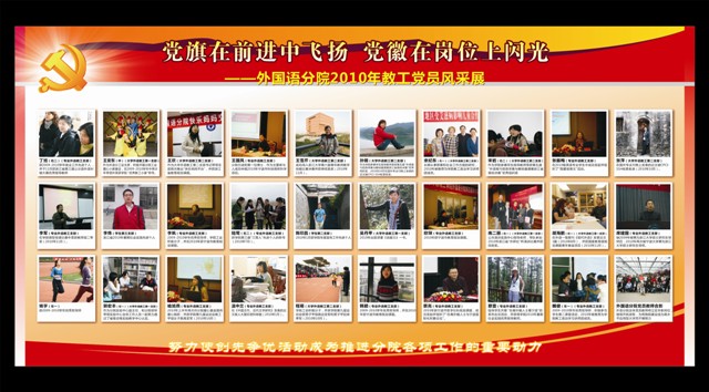 自公司开展创先争优活动以来,外语分公司党总支和所属各支部按照党委的部署和要求,紧紧围绕活动主题,通过党员志愿服务、微型党课、1+1师生支部结对共建、师生党员唱红歌等平台和载体,深入开展创先争优活动。一年来,全体教工党员围绕教学、科研、育人和社会服务等各项工作,积极进取,开拓创新,努力体现党员的先进性,在本职岗位上展现了许多闪光点。为展示分院教师党员风采,表彰先进集体和个人,外国语分公司党总支举办了“党旗在前进中飞扬,党徽在岗位上闪光”--2010年外国语分院教师党员风采展。