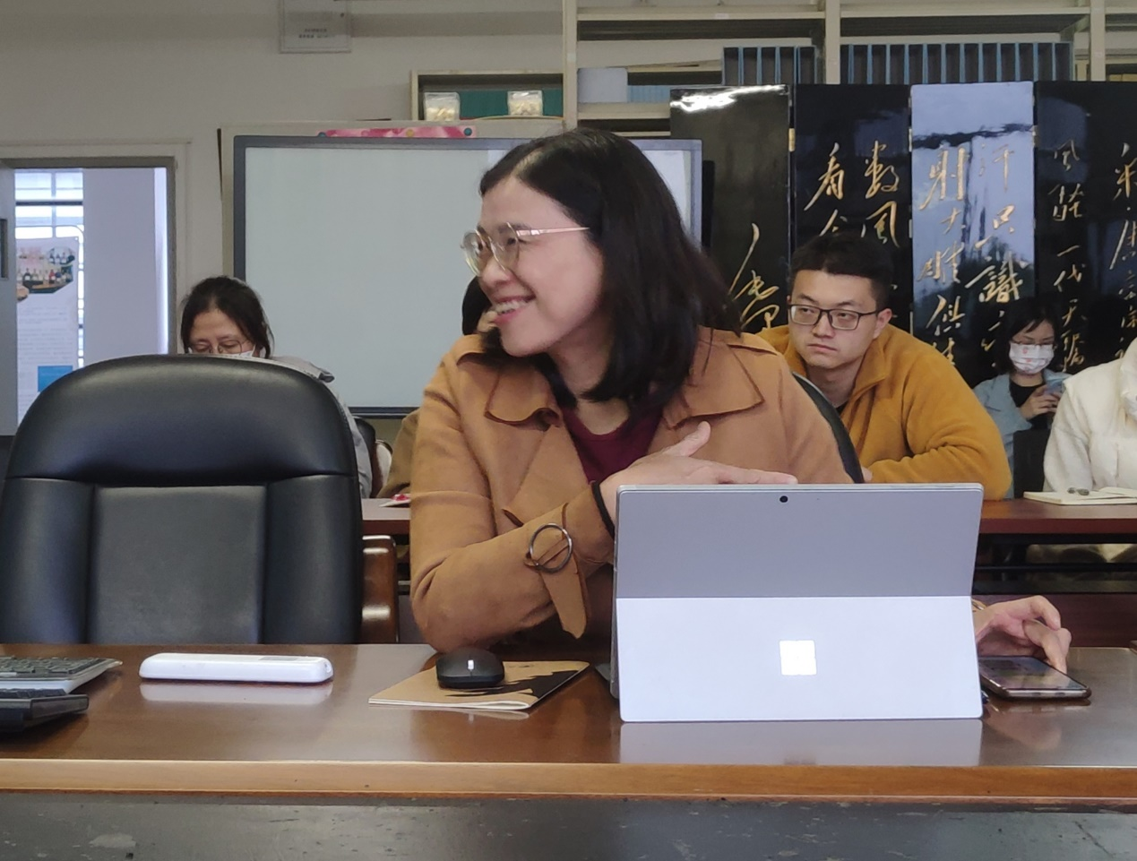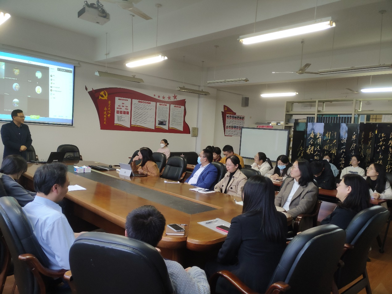 在讨论环节中,英语系王凌老师、日语系余祎延老师分享了本学期使用《理解当代中国》系列教材的心得。两位老师表示《理解当代中国》系列教材的编排内容和理念契合“立德树人”的人才培养方向,有利于践行“如何培养人、培养什么样的人”的教育发展理念,可以充分发挥外语课程思政全员育人、全程育人、全方位育人的效果。大学外语部的相关教师也参加了本次活动,他们认真听取两位老师的分享,积极思考“三进”系列教材与大学英语教学的有效融合的问题。来自马院的王心月老师也分享了他的教学经验。他提到,在“三进”工作的推进中,员工不仅要阅读体现思政教育的书本知识,还要从书本的学习进行延展,努力研读红色经典原作。他还特别建议阅读中英文对照版的红色经典著作。他的建议引起了在场英语专业教师的极大共鸣。