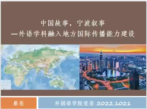 会上,公司党委委员、副经理蔡亮教授结合学习二十大精神做了题为“中国故事,宁波叙事:外语学科融入地方国际传播能力建设”的报告。他分析了“要推进文化自信自强,铸就社会主义文化新辉煌”的内涵,梳理了习近平总书记关于讲好中国故事的论述,从宁波的叙事学、故事的发生地、讲故事的视角、讲故事的主体等方面,结合团队国际传播实践,阐释了外语人讲好宁波故事现实意义,并用生动鲜活的事例讲述外语学科融入地方国际传播的路径与思路等问题。