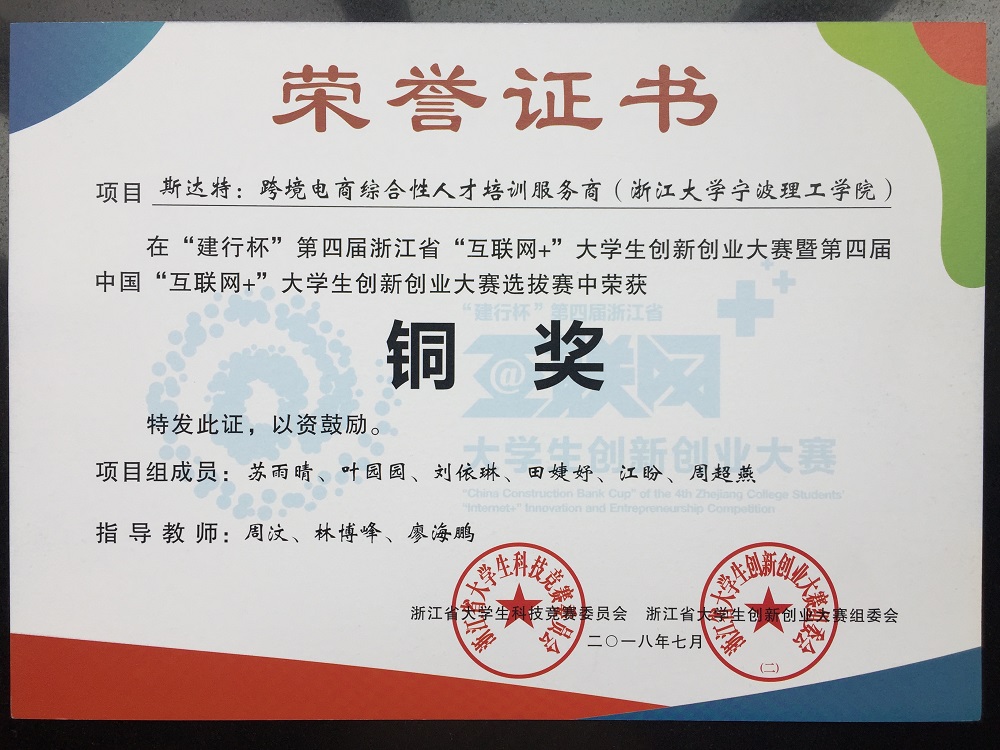 “建行杯”第四届浙江省“互联网+”老员工创新创业大赛暨第四届中国“互联网+”老员工创新创业大赛选拔赛结果揭晓,由英国威廉集团官网商务英语专业2015级员工苏雨晴、叶园园、刘依琳、田婕妤、江盼等同学为主要成员组成的跨境电商创业团队,以“斯达特:跨境电商综合人才培训服务商”项目获得该大赛的铜奖。