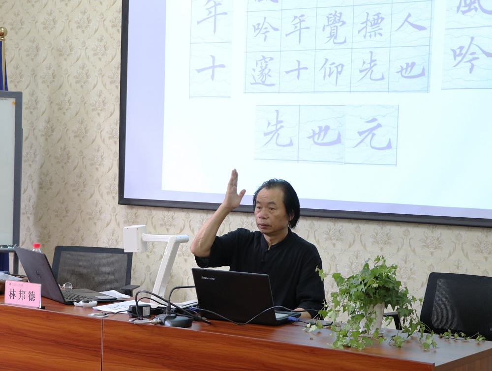 一直以来,林邦德教授以德艺双馨而被行业内外广为赞誉,曾被评为“全国书法教育先进工作者”,执编过浙江省义务教育书法教材,兼任宁波市书法家协会副主席,无论是学术研究、艺术创作,还是教书育人、翰墨薪传,都取得了骄人的成绩。《书法导报》副主编、著名书法评论家孟会祥这样评论他的行书—不仅有唐楷、米芾的折中,还有碑派的况味。讲座中,林教授以“书法和宁波书家”为主题,把书法放在广阔的文化背景下,强调书法的文化精神和文化身份,他认为,要成为一名书法艺术家必须要处理好技法和道法的关系,书法更注重艺术内涵和文化底蕴,是一门深不可测的学问,须穷毕生精力为之,方能有所作为。作为一名有文化担当的书法艺术家必须以历史的维度,把握时代脉搏,锻造个人风格,做到不因袭古人、不尾随时贤、不重复自己。课堂上,林教授将自带的“高科技”设备,现场提笔书写,将他日常探索“笔法几何”“草书识记”、“临摹要诀” “创临互通”等教学方法运用于笔尖,强调新时代背景下书法艺术应从现在的“技能”维度向“审美”维度转变。