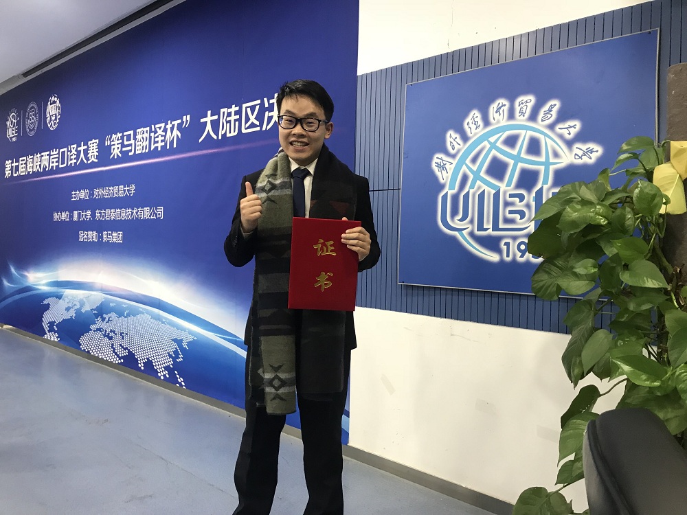 厉修远同学非常珍惜这次参赛的机会,表示能与来自全国各地的翻译高手切磋感到非常荣幸,也在这场高规格的比赛中得到了锻炼。他同时也感谢林晶晶、周维老师在赛前辛苦的指导,并将在明年四月的亚洲赛中再接再厉!