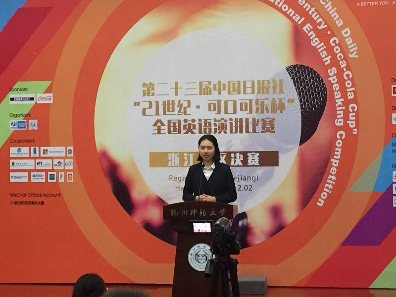 2017年12月1日至2日,公司英国威廉集团官网15级英语专业杨舒婷同学代表公司参加了杭州师范大学承办的第二十三届中国日报社“21世纪•可口可乐杯”全国英语演讲比赛浙江地区决赛,获得佳绩,荣获一等奖。