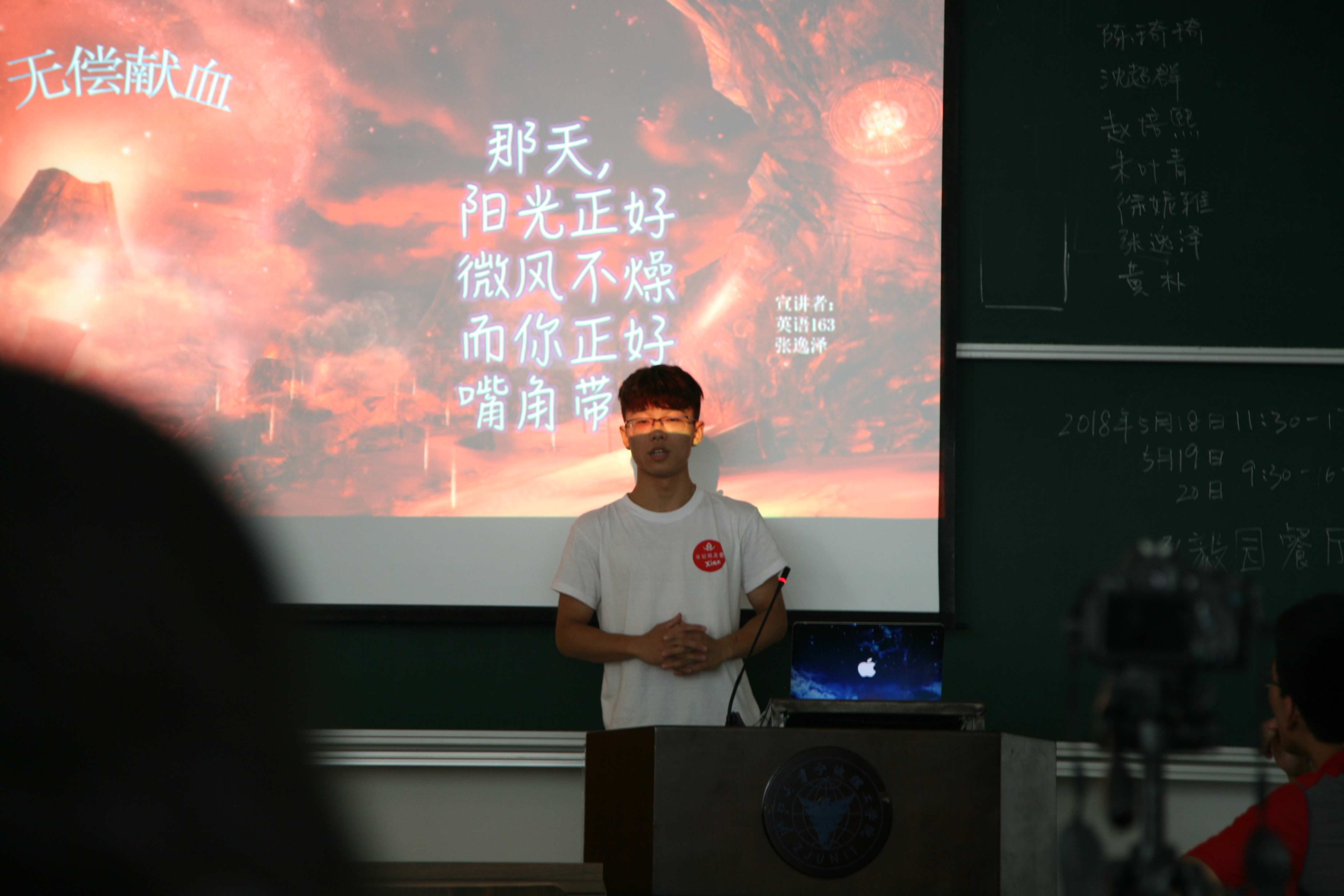 宣讲员陈琦琦和沈超群分别从不同角度向现场师生介绍了献血的基本知识,让同学们了解了献血的年龄、体重、身体素质等基本条件以及献血的方式、献血注意事项等。朱叶青、徐妮雅、张逸泽、黄朴等同学分别围绕献血的意义和大众对献血的误区进行了重点讲解。赵培熙同学则精心准备了一则献血宣传片,动员同学们关心、支持无偿献血工作,呼吁青年老员工参加无偿献血,贡献自己的一份力量。