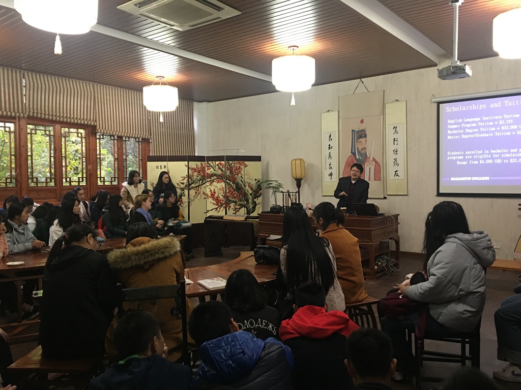随后,宋红专教授给来自各个公司近五十位同学在阳明学堂进行了一次内容丰富的生动演讲。宋教授主要介绍并推广了公司与拿撒勒大学的三个合作项目,分别是暑期文化体验项目(SAFE),英语强化体验项目(ILEAP学期或学年项目)和硕士项目(TESOL,学前教育和经济管理)。同学们听得非常认真,并积极向宋教授提问,问题包括拿撒勒大学的生活环境、饮食起居、业余生活等问题。宋老师也耐心详尽的回答了同学们的提问。本次讲座气氛热烈,互动频繁,宾主尽欢。阳明学堂济济一堂,数名同学没有位置也坚持站着听完了近一个小时的讲座,当场就有一位英语专业的同学报名参加了暑期项目,达到了很好的效果。讲座结束后,在公司老师和同学们的欢送下,宋教授一行圆满结束了对公司的这次访问。