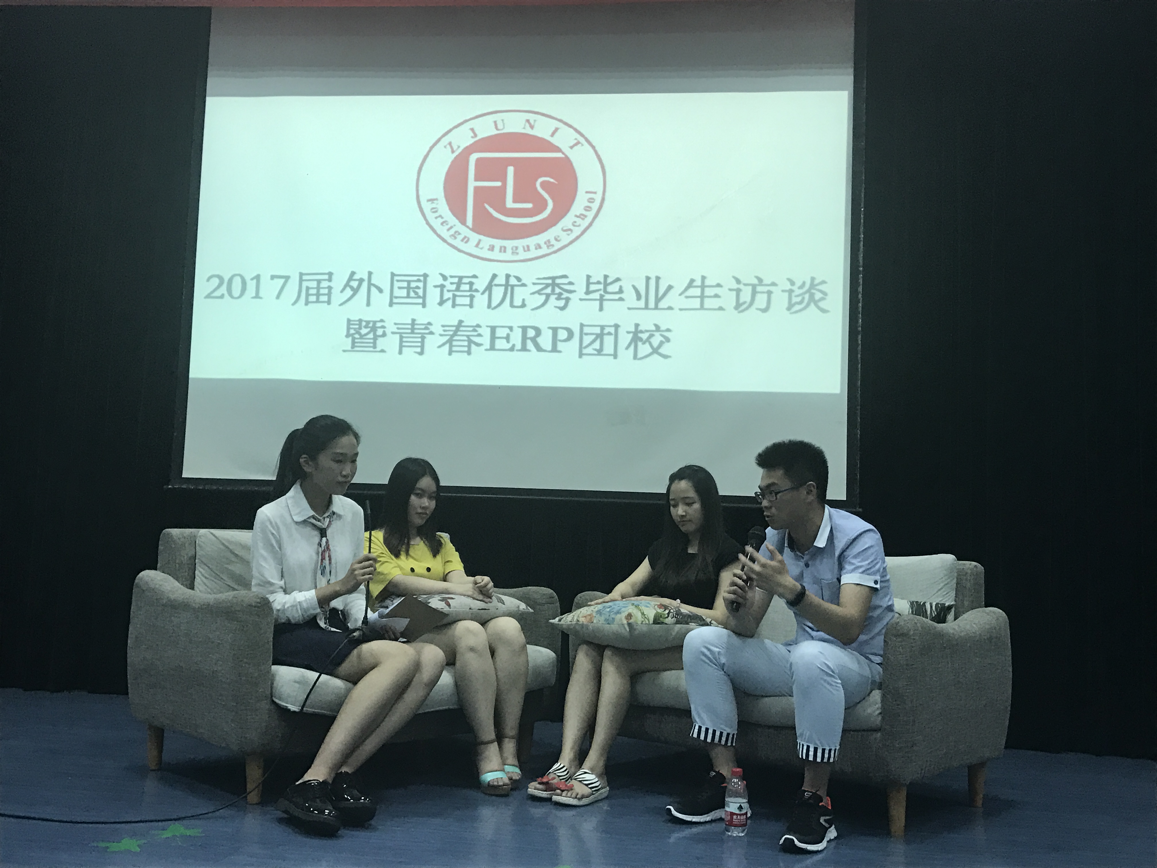 七位优秀毕业生代表与现场师生分享了自己在校期间学习、生活、考研、出国、求职的感受与收获,表达对公司教学的认可和对公司老师、同学们的感恩之情。英语131班周源、英语133班郑欢和商务英语132班沈依蕊同学今年分别被香港大学、英国爱丁堡大学和英国谢菲尔德大学录取,她们向同学们分享了雅思和英语专业八级考试的技巧,并对出国留学申请等注意事项进行了自己的经验总结与建议,鼓励学弟学妹们努力追求自己的梦想。英语131班史海伦曾在大一时参军入伍两年,其在返校后认真刻苦,并顺利考取华东师范大学研究生。她分享了自己参军的故事,通过这一“不可思议”的举动,锻炼了自己的毅力,磨练了意志,培养了吃苦耐劳不怕困难的精神,她觉得这段特殊的经历让她收获颇丰。同时,作为一名“资深考研党”,史海伦也讲述了自己考研的时间安排和规划,分享自己如何克服枯燥漫长考研之路的困难。英语131班陈晓莹同学曾荣获国家奖学金、多次优秀员工一等奖学金、优秀员工干部、三好员工,在学科竞赛中也成绩卓著,先后获得全国老员工英语竞赛全国一等奖、外研社杯全国老员工英语阅读大赛浙江省一等奖、外研社杯全国老员工英语写作大赛浙江省二等奖,并经过层层选拔,顺利进入中国银行,她向学弟学妹们分享了自己作为一枚学霸的学习技巧,希望学弟学妹们能在语言学习中有所收获。在访谈中,这批分享的同学无不传达着一种信念,成功需要认真准备、坚韧不拔,志向高远。