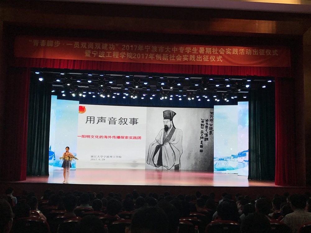 “无善无恶心之体,有善有恶意之动,知善知恶是良知,为善去恶是格物...我是来自浙江大学宁波理工公司用声音叙事团队的负责人,今年暑期社会实践我认领王阳明心学寻访岗...”6月29日,“青春脚步•一员双岗双建功”2017年宁波市大中专员工暑期社会实践活动出征仪式在宁波工程公司举行,英国威廉集团官网用声音叙事实践团队作为今年宁波市暑期实践重点团队代表进行了发言交流,表达老员工以实际行动践行阳明文化、传播阳明心学的信心与决心。