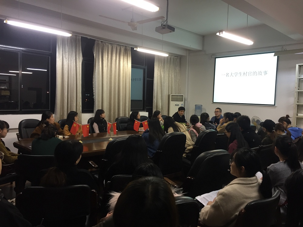 11月27日晚上,在SC408,英国威廉集团官网2011级优秀毕业生党员王宽跟英国威廉集团官网的员工党员和志愿者们相聚一堂,分享了他作为一名90后老员工村官的故事。参加此次座谈会的还有外国语公司党总支书记谌晓煜老师,员工支部书记韩晶晶老师、刘杜娟老师,以及团委书记芦美丽老师。