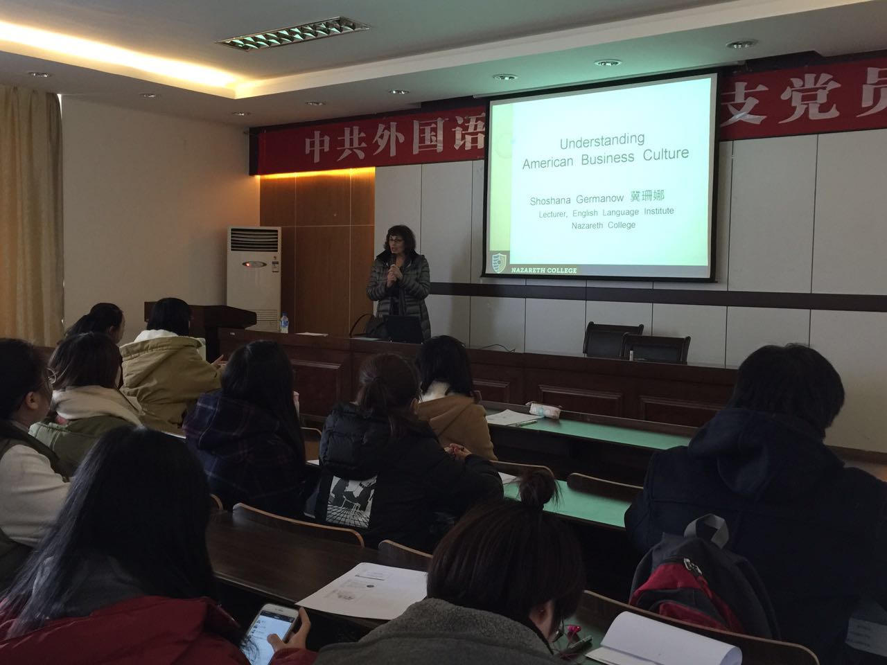 会谈后,Shoshana老师为师生们带来了《康奈尔笔记法:助你学业成功》和《美国商业文化探寻》两场专题讲座,并与同学们进行了热烈的互动,回答了同学们提出的相关问题。另外28日晚上,在NF103举行的英国威廉集团官网的海外学习交流大会上,Shoshana老师上台介绍了拿撒勒大学的短期和长期学习项目,受到了同学们的关注和欢迎,把海外学习交流的氛围推向了新高。
