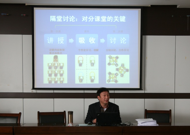 讲座开始,张学新教授首先向大家简要介绍了“对分课堂”这种新型的教学模式,并从这种教学法的缘起、发展过程、操作方法、教学效果、深层理念等四个方面深入浅出地介绍了“对分课堂”教学法的理念和思想。根据张教授的介绍,“对分课堂”教学法的核心理念是把一半课堂时间分配给教师进行讲授,另一半时间分配给员工以讨论的形式进行交互式学习。该方法在实施过程中,最关键的一点是教师要把讲授和交互式学习在时间上分隔开来,让员工有充分的时间进行内化吸引并自我思考,形成自己的思想或观点。朱桦博士随后介绍了其《美国文学课程》的对分课堂实践和应用的情况,通过具体案例向大家展示了对分课堂的教学效果。最后,张学新教授向参会的老师们具体介绍了“对分课堂”教学法应用的方法和技巧。