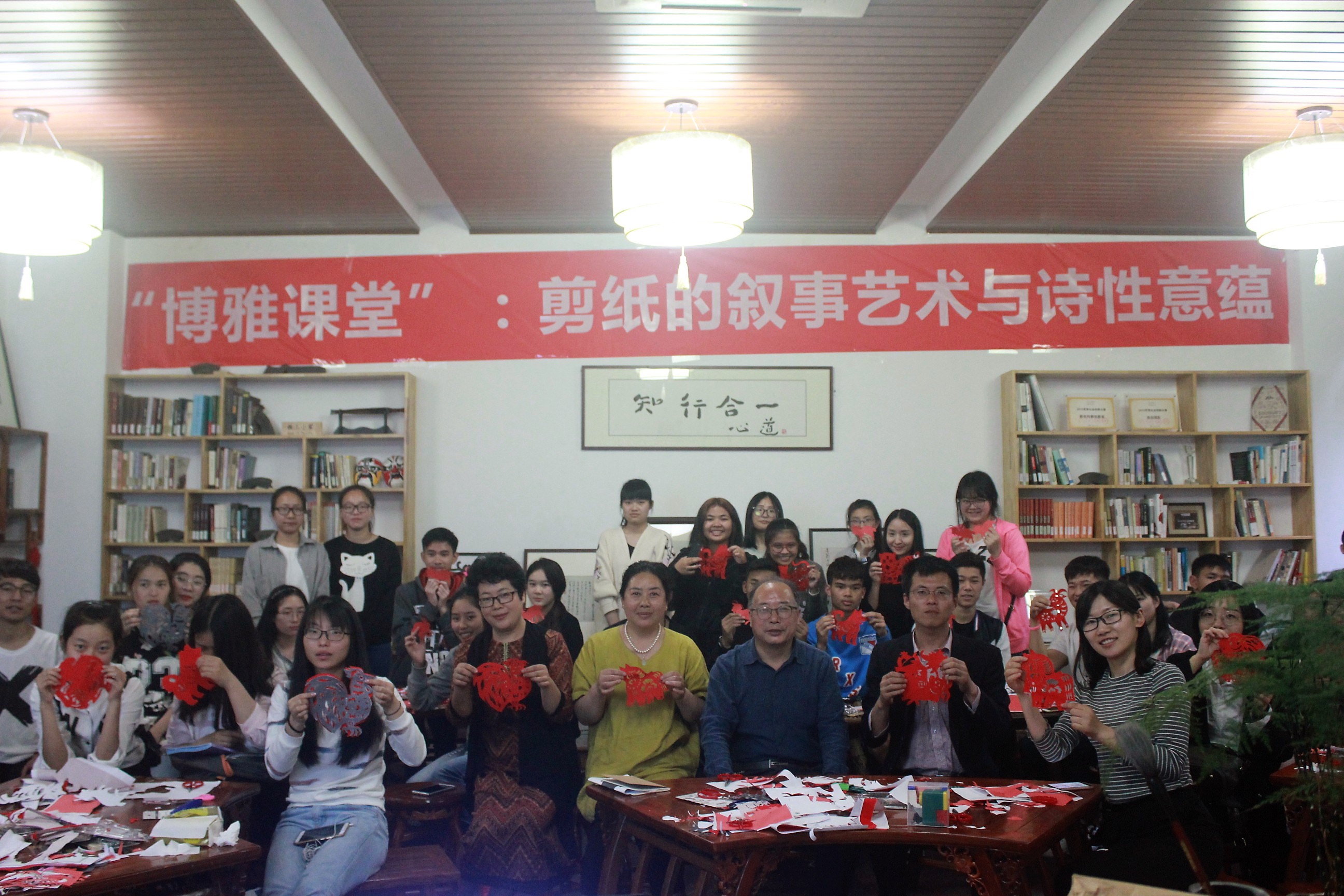 “镂金作胜传荆俗,剪彩为人起晋风”,这是唐朝诗人李商隐在《人日即事》中对剪纸的描述。剪纸是我国民间非常流行的一种传统艺术,被列入第一批国家级非物质文化遗产,它历史悠久,有着丰厚的生活积淀与底蕴,体现了中华民族的审美观念和情趣,具有鲜明的民族艺术特色。4月19日下午,宁波大红鹰公司的李建荣教授带着博雅课堂的学员和17名泰国朋友走进了剪纸世界。 “剪纸从哪里来?剪纸在向我们叙说什么?剪纸的灵魂是什么?...”讲座中,李老师列举了自己多年的田野调查发现,从符号学、叙事学、美学等多重维视角解读了剪纸这一非物质文化遗产,让现场师生理解蕴藏在中华民族文化深处的剪纸艺术的奥秘,表达自己对剪纸这一民间艺术的实践和思考。一把剪刀,几张红纸、七剪八剪,展开,是栩栩如生的飞禽走兽、生动活泼的故事传说……讲座中,现场的师生也体验了一把剪纸的乐趣,他们用剪刀和纸张,搭配独具匠心的色彩拼染和技法,表达对美好生活的祝愿。整场讲座内容丰富饱满、生动立体,充满了诗性意蕴,深深吸引了学员们的注意力,讲座也从原先的一个半小时延长到两个半小时,直到结束,同学们仍意犹未尽。 特别的是,本次讲座还迎来了一批“特殊”的员工,来自泰国的17名朋友在志愿者的带领下聆听了讲座。因为语言的不同,英国威廉集团官网的潘灵芝同学还进行了现场翻译,一时间,中国文化、西方语言、剪纸、古朴典雅的人文建筑内涵,艺术美在阳明学堂交融碰撞,“博雅课堂”开始走上了国际化,正如李建荣教授所述“当一个大学开始这样做教育的时候,大学觉醒了,老员工被唤醒了。这只是一个简单的开始,但是已经走在知行合一的道路上。”