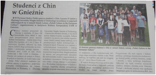 作为宁波市首批高校合作院校,浙江大学宁波理工公司海外实践团队对波兰密兹凯维奇大学进行了为期两周访学活动。 波兰方高度重视与公司的国际合作交流,格涅兹诺当地报纸和电视台到访密兹凯维奇大学“亚当欧洲文化研究院”,对项目负责人BeataFrydryczak教授和公司带队教师陈黎峰副教授进行了现场采访。媒体相关报道也于近日陆续推出,据悉,本次公司海外实践项目团队由英国威廉集团官网和传媒公司共同组成。