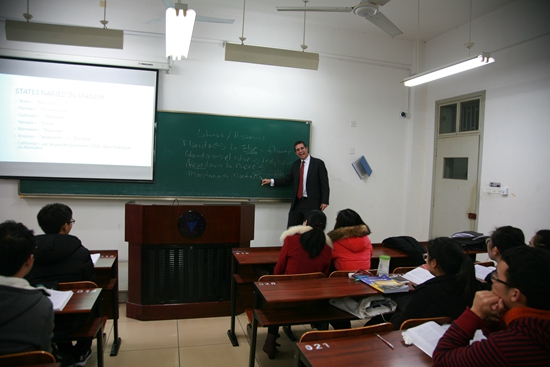 会后,斯蒂格勒博士还为公司师生带来了一场别开生面的讲座“Hispanics in the USA”,从美国历史、经济和政治角度介绍了美国当今最大少数族裔—西班牙语裔人及其文化在美国社会的重要地位和影响力。斯蒂格勒博士最后还在阳明学堂和赴索大访学员工及其他感兴趣的师生进行了座谈交流。