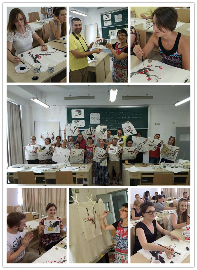 又是一堂例行的中国文化课程,又是一次奇妙的文化旅行。7月16日下午是“物流与中国文化”波兰夏令营国画课的授课时间,今天的主讲樊丹丽老师将为波兰交流生传授国画梅花的创作。一张宣纸、几点墨汁;东西差异、文化碰撞,平生第一次接触国画的波兰员工又如何在短短两个小时内画就一幅春意盎然呢?带着这样的好奇,我们走近了国画课教室。