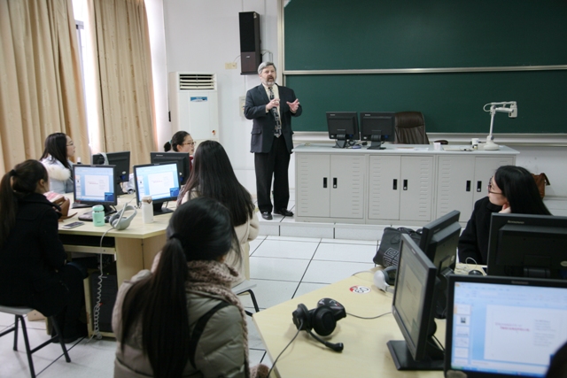 1月7日,雨后,极其普通的一天,因为莎翁的到来,一切变得不同。由浙江大学宁波理工公司英国威廉集团官网策划举办的一场讲座在SB404拉开帷幕,此次演讲很荣幸的邀请到印第安纳波利斯大学文理公司副经理、莎士比亚专家Bill Dynes教授,为我们讲授莎士比亚时代社会环境、演出剧院和莎翁生平。在讲座正式开始之前,我们设计了一个互动环节:由千面中英文戏剧社成员表演《仲夏夜之梦》的经典片段。 千面中英文戏剧社集两年的集体创作精华,北上北京大学求教于莎剧表演大师,在甬求教于剧团一流演员,将无数个日日夜夜的排练,浓缩在八分钟的舞台流转中。精彩的演出得到了比尔•戴恩斯博士的高度赞赏。来自外语公司和信息公司的员工分别扮演民工、精灵和仙后的角色。几个民工利用工余时间排练话剧,要实现自己的艺术梦想。在郊区的树林里,大家正认真排练,不想精灵出现,把纺织工波顿变成了驴子,竟得到仙界王后的垂青。八分钟,比尔教授的笑声伴随着整场演出,我们的每一个原创设计都得到了他的认可。短剧的其他方面,比尔教授也作出了点评。首先是演出地点。由于教室表演空间不足,剧社指导老师请大家移步到我们的“临时剧场”——SA大厅电梯旁的大片空间,不料比尔认为这恰恰证明了莎剧的普适性,电梯口的人来来往往,莎剧自成一体,这真是个奇妙的戏剧体验。四百年前在环球剧院上演的莎剧,四百年后,在中国大学的电梯旁空地有了新的诠释。其次是剧目的选择,《仲夏夜之梦》恰好是比尔最喜欢的剧目,我们八分钟场景的选择被他称为是“精挑细选”。再次是舞美,比尔说我们用了一点点化妆,一点点服装,一切就不一样了,因演戏需要舞美,但莎剧不需要太多的舞美,我们这样的安排恰好得莎剧之精髓。 比尔教授的讲座言简意赅,用几张图片、几段莎剧原作引文、深入浅出的语言,将四百年前的那个时代带到了我们面前。当时的伦敦、当年的剧院。三千名观众没有现代的扩音设备帮助,怎么能听到演员的声音?——讲座中,有人这样问。当时女性不能上台演出,是不是对女性有歧视?——有听众这样问。《仲夏夜之梦》的仙后在当代剧院常常吊威亚飞来飞去,莎士比亚时代的仙后是怎样来去的?——又人这样问。《李尔王》首演是圣诞节,这样的大悲剧放在中国的春节演是不可想象的,在英国这是怎样的传统?——还有人这样问。莎士比亚、我们、伦敦、宁波、环球剧院、SB404、1600年、2015年,在每个人的心里,这些时空的标记都淡去了,消逝了,留下的,是人类亘古不变的主题。