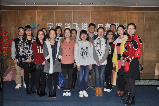 当天,在公司业务经理曾小姐的热情带领下,大家首先参观了公司共五层楼的样品摆放库。参观过程中,员工们被琳琅满目的商品所吸引,并积极和曾经理就外贸方面的知识进行学习交流。参观结束后,华飞公司总经理关先生专门抽出时间与全体师生开展了主题座谈会。座谈会上,华飞公司曾经理首先详细介绍了公司的经营内容、企业文化和荣誉,同时华飞公司也鼓励同学们积极到他们公司实习就业。座谈中谌书记以现在华飞公司工作的外语员工盛方同学为例,认为华飞公司是一个注重员工发展、讲究企业文化、发展势头强劲的优秀外贸公司,考虑到现在老员工培养普遍存在课堂知识与工作需求能力存在一定差距的问题,谌书记与华飞公司探讨“订单式员工”培养问题,双方就此展开了热烈的讨论,华飞公司关总当即表示将着手开展这一工作,争取合作有所成效。